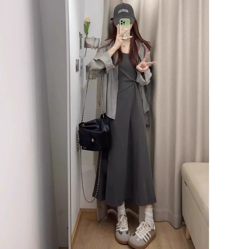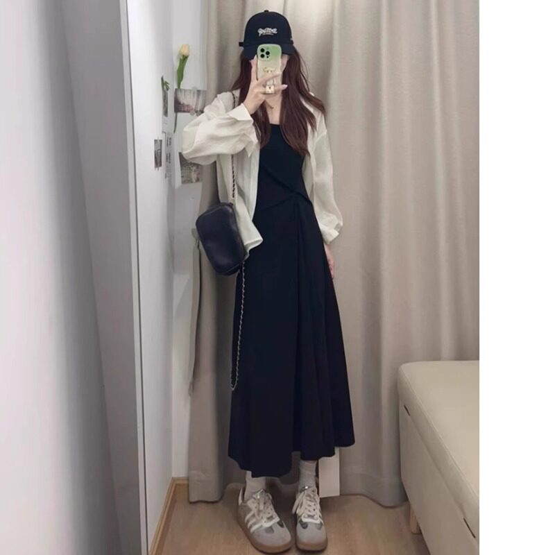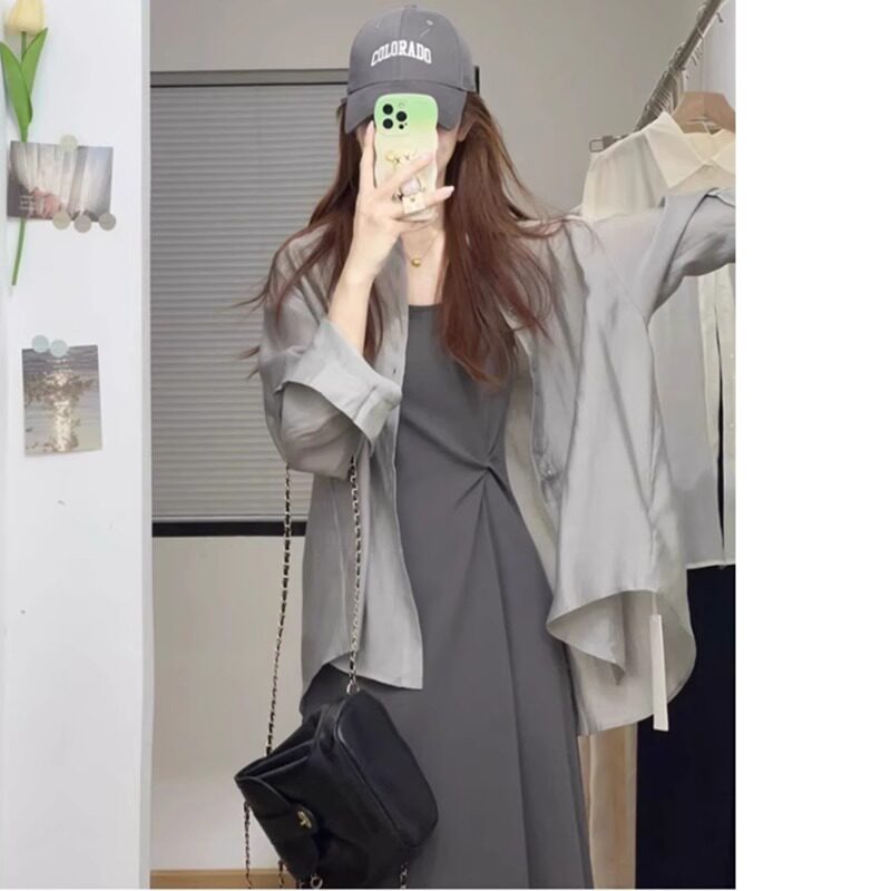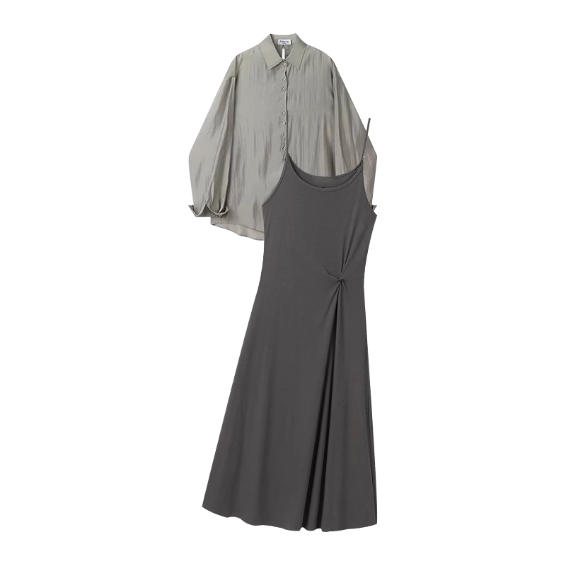孕妇连衣裙套装春夏2026新款长袖防晒衬衫法式抽褶吊带裙两件套女
