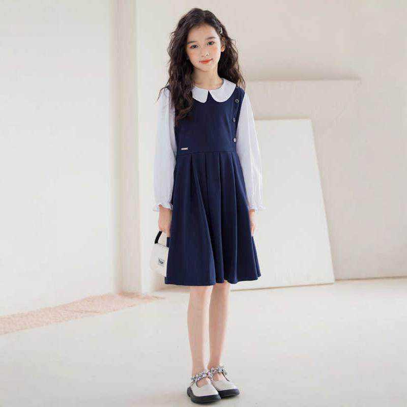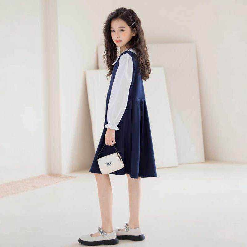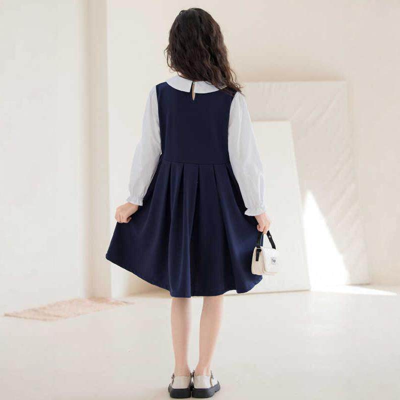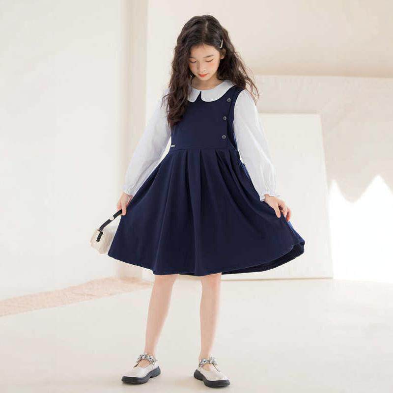 长袖女童连衣裙春秋款学院风藏青色初中生棉布裙子韩版洋气A字裙