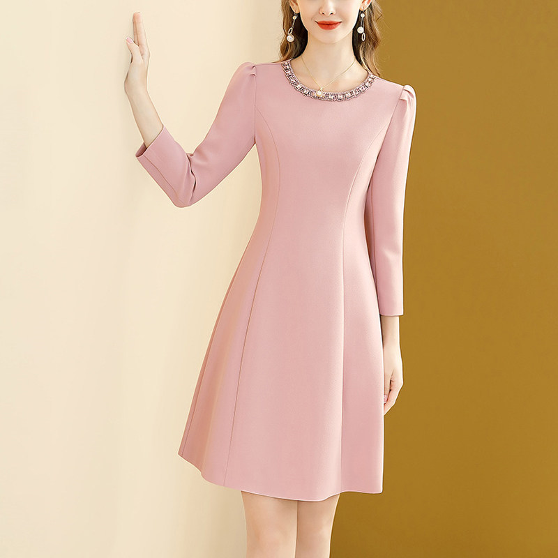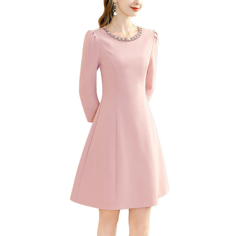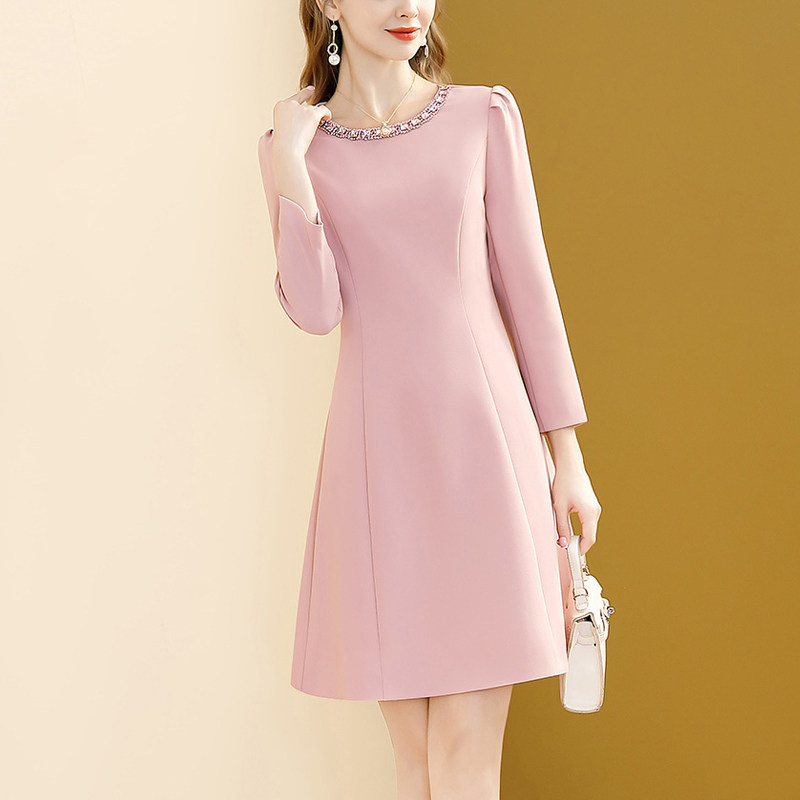 粉色千金风长袖连衣裙女2026春装新款名媛镶钻收腰显瘦小个子裙子