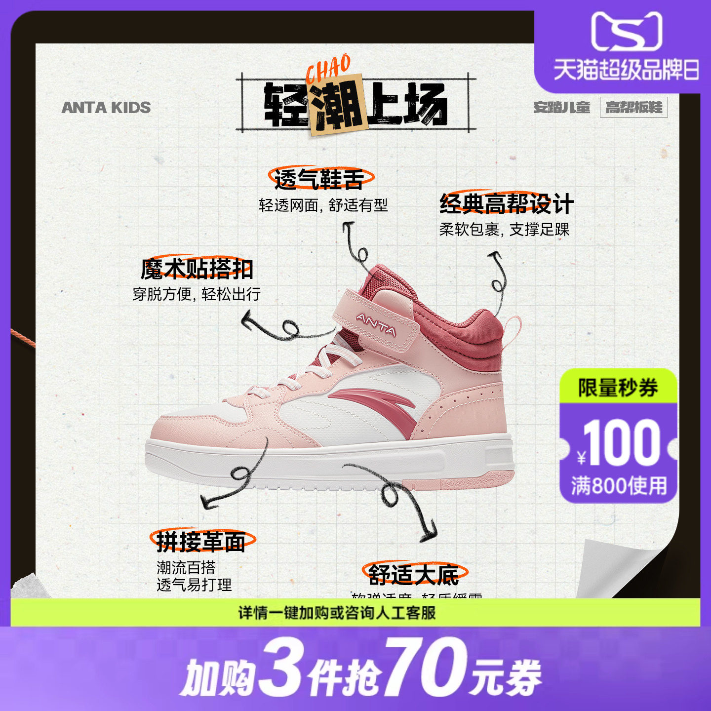 安踏儿童女童板鞋2026冬季新款皮面鞋子高帮休闲鞋童鞋秋冬运动鞋