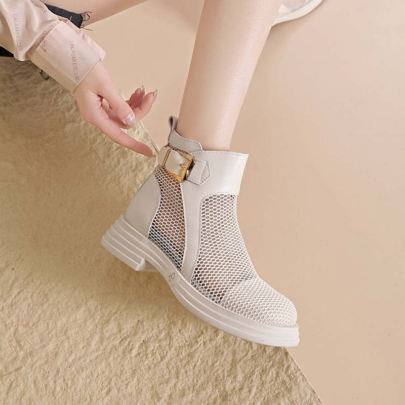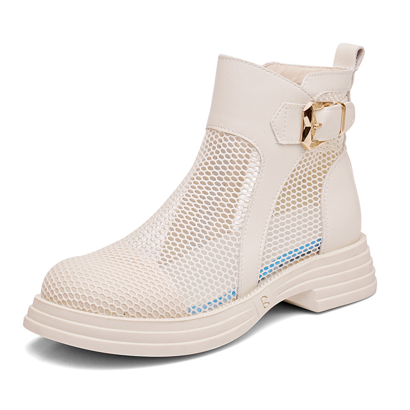 夏季网靴女透气薄款真皮马丁靴女凉靴米色夏天镂空网面凉鞋配裙子