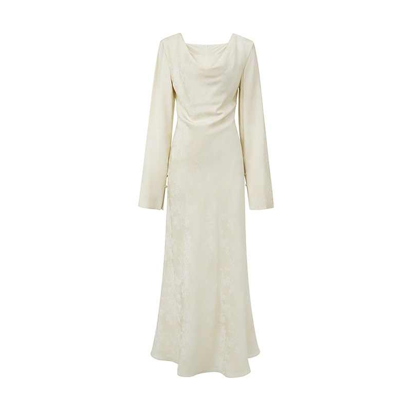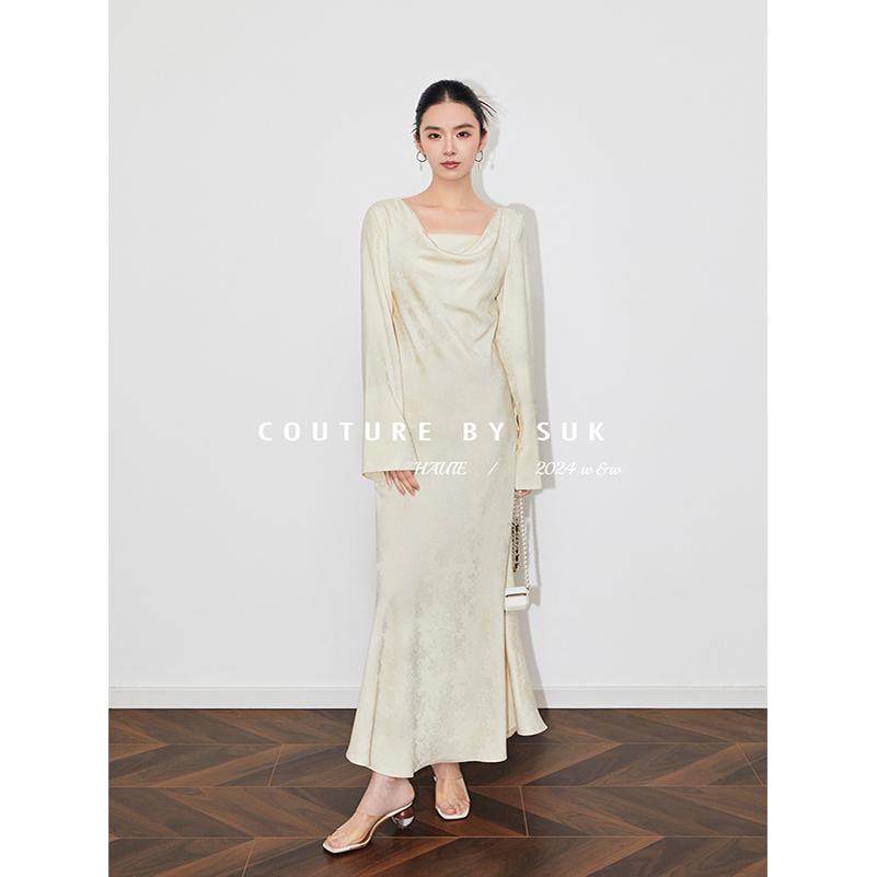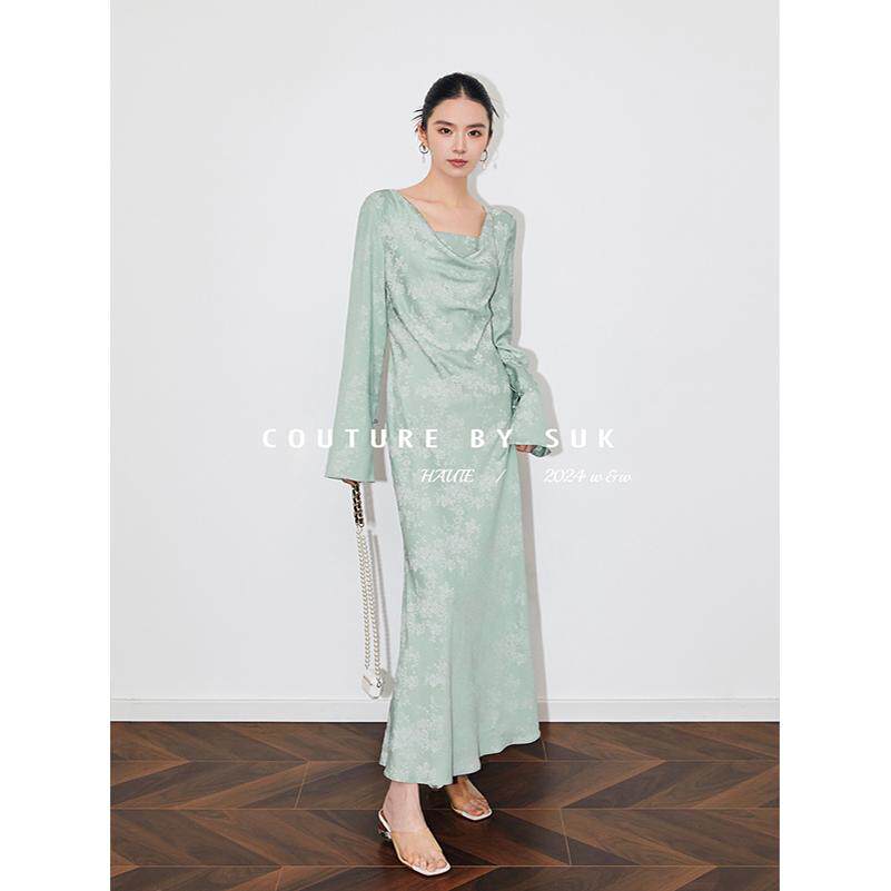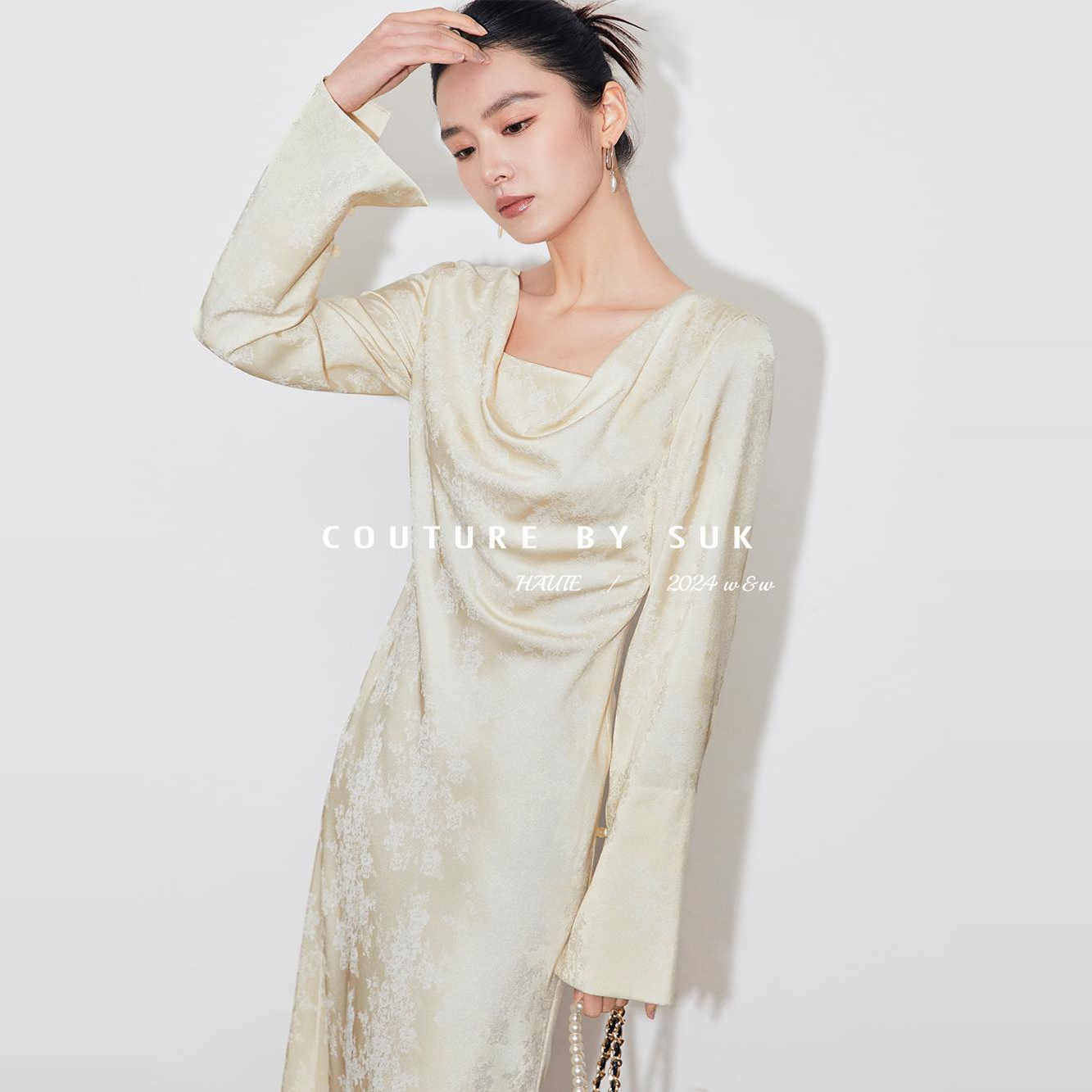 SUK 绘春之颜!订制提花面料垂感温柔荡领长袖收腰显瘦连衣裙