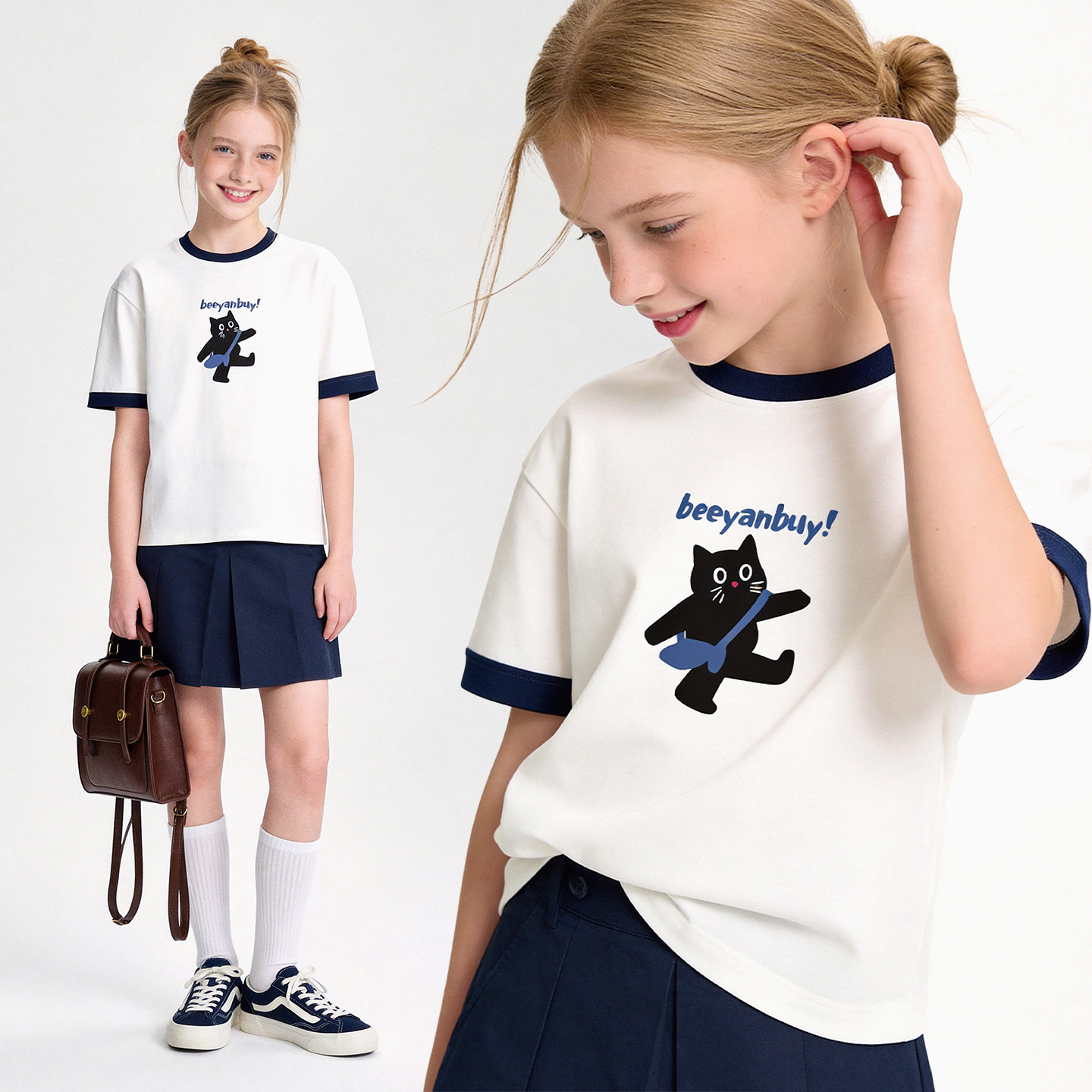 女童短袖t恤夏季新款儿童上衣大童卡通打底衫青少年白色宽松童装