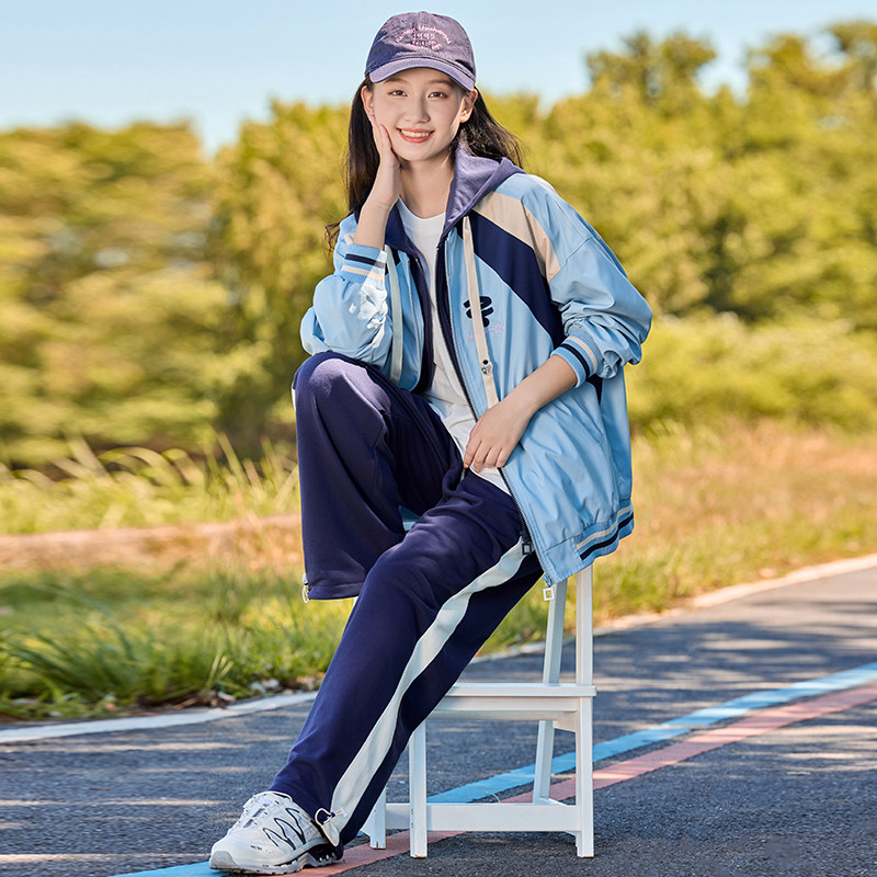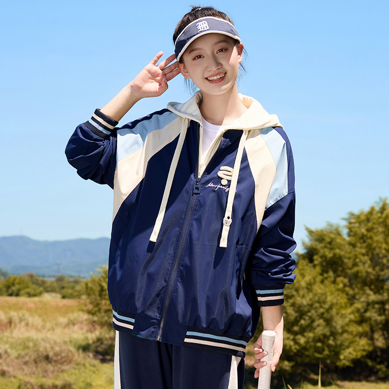 初中生春装外套少女春秋新款夹克大童假两件高中女孩运动上衣连帽