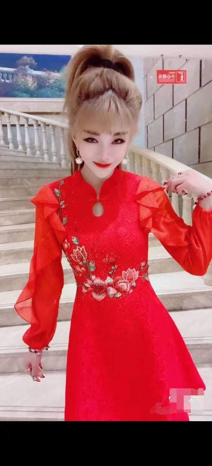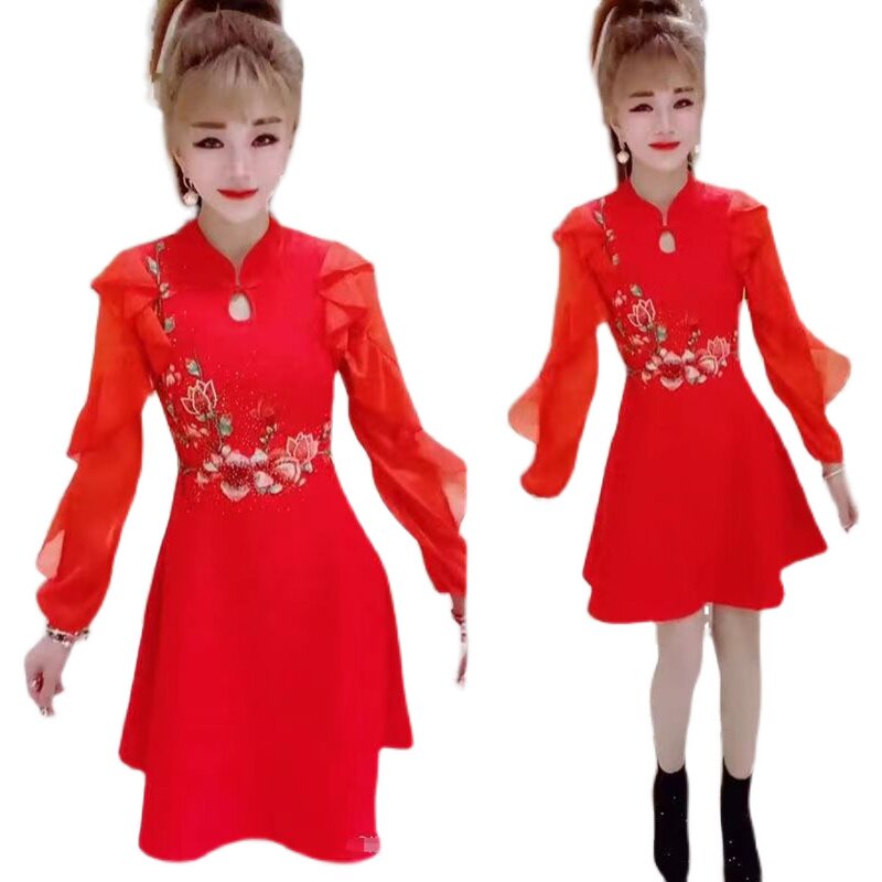 2025女装连衣裙长袖修身烫钻刺绣礼服中国红色气质打体衫高端礼服