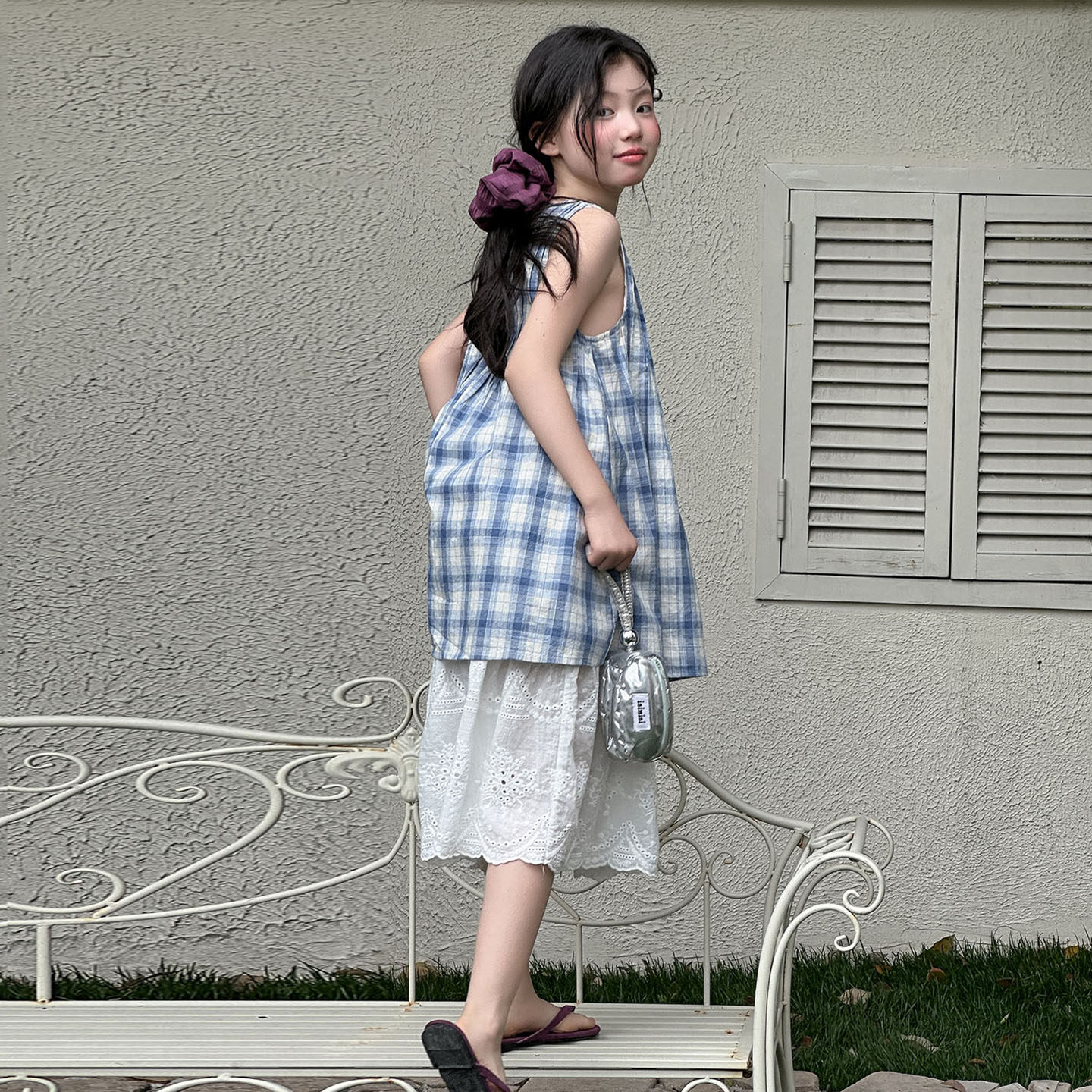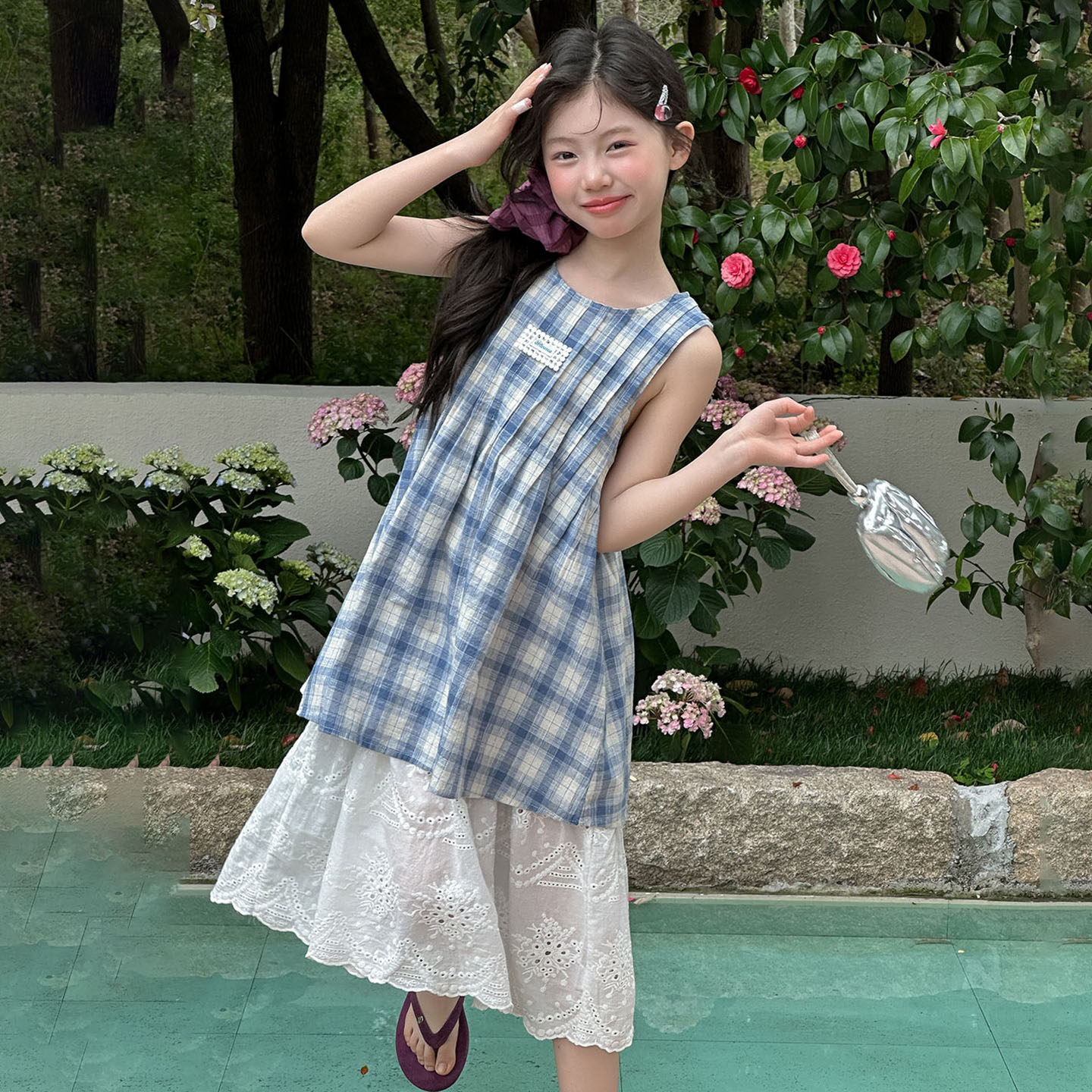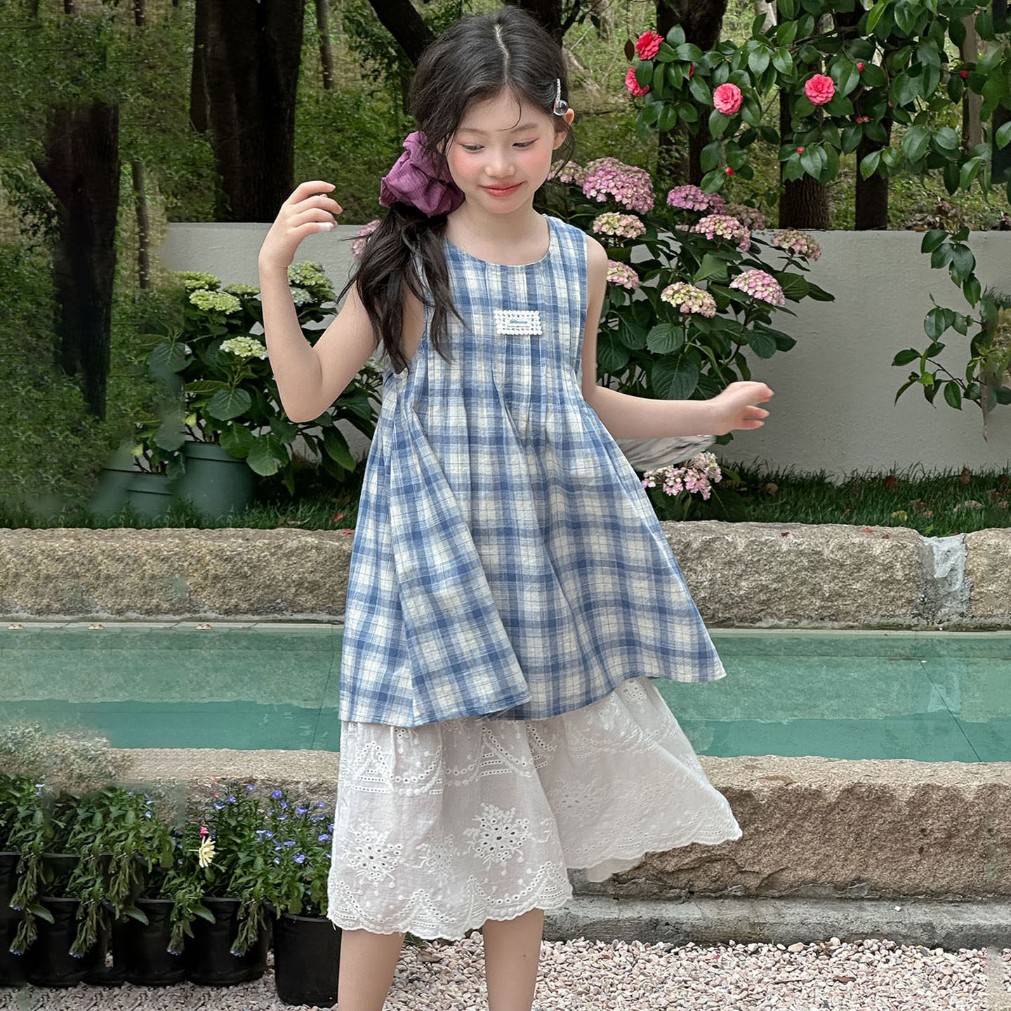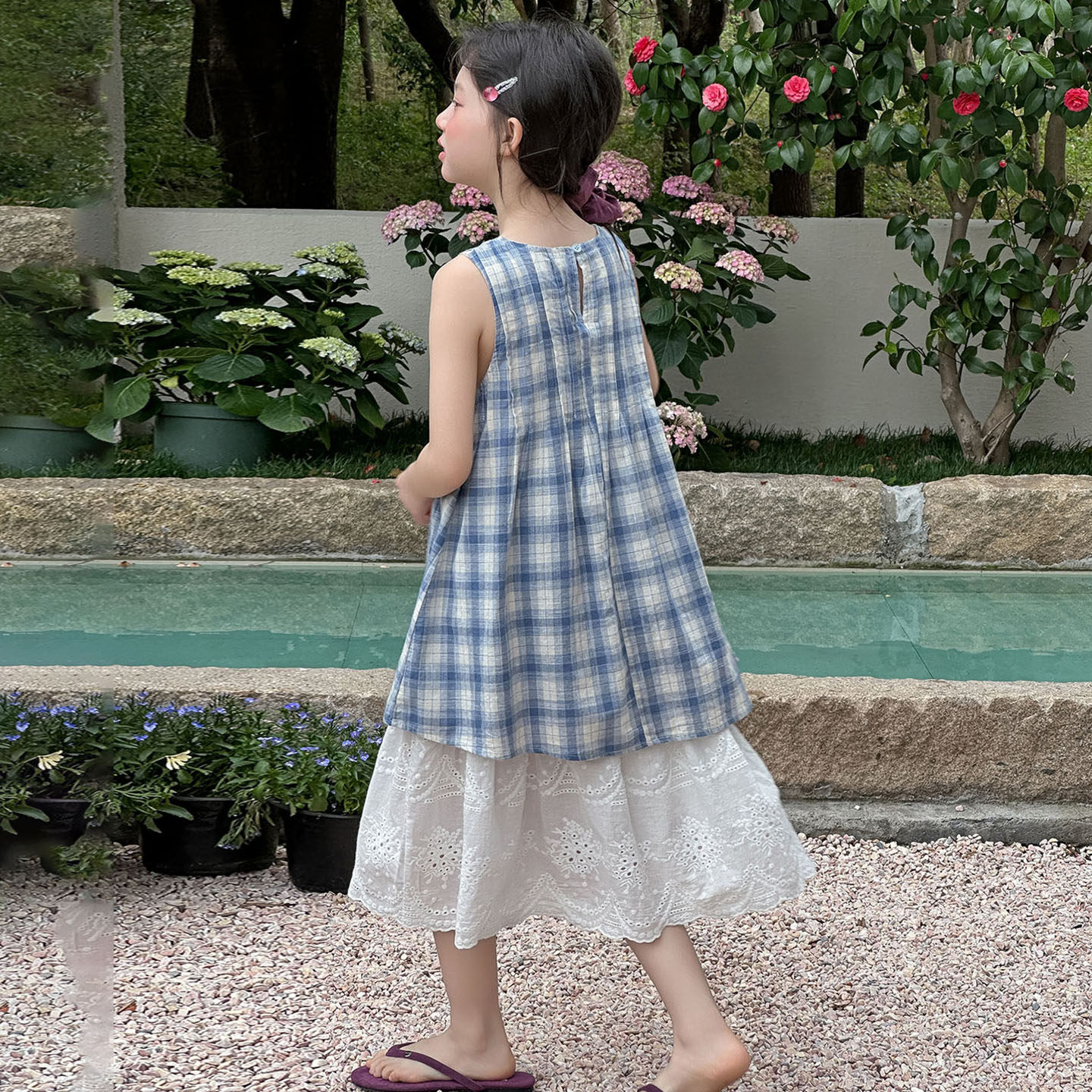 女童蓝色格子连衣裙2026新款小女孩夏季假两件海边穿搭度假长裙子