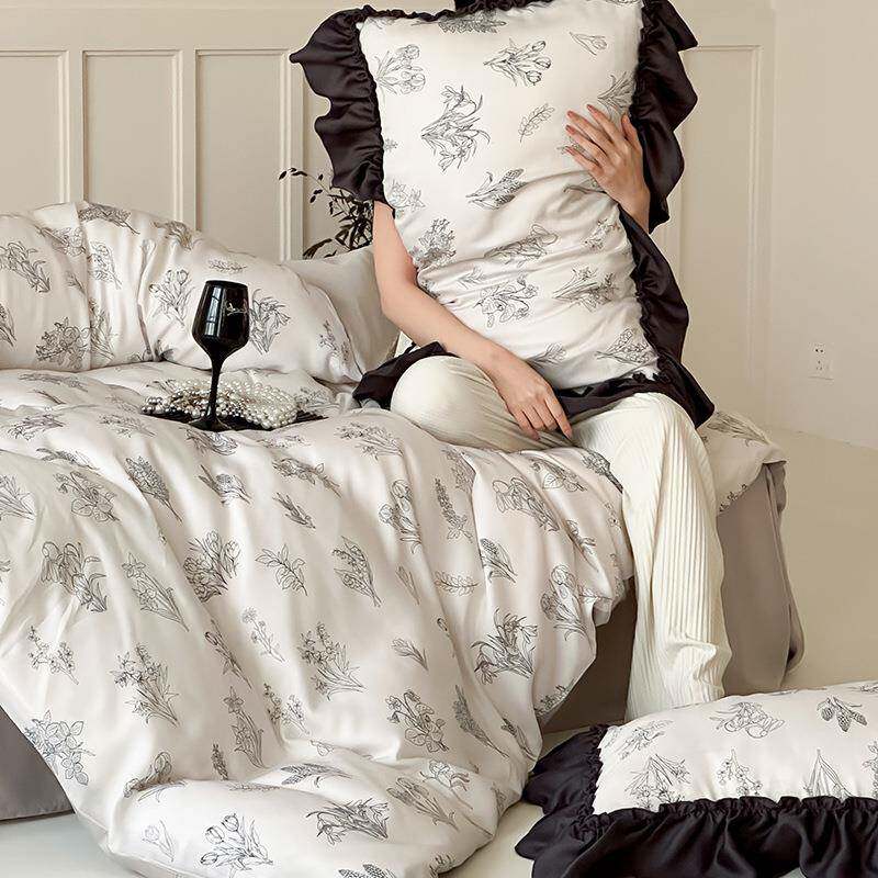 夏季莱赛尔天丝床上四件套冰丝凉感夏天法式公主风黑色荷叶边床品