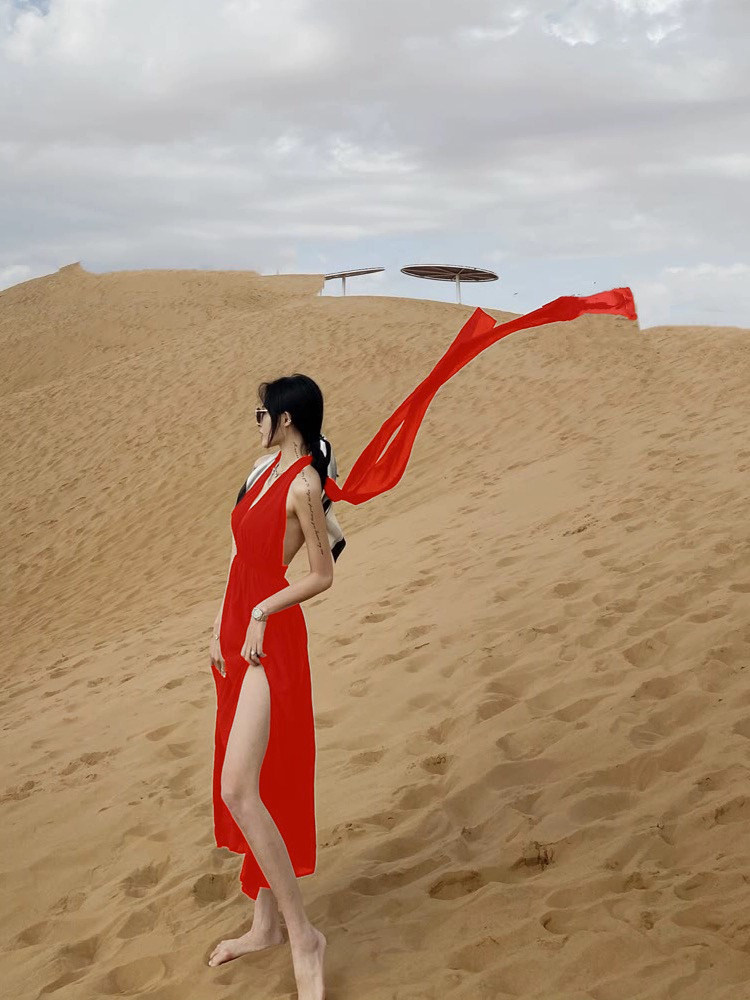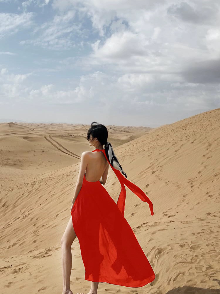 三亚沙漠海边度假沙滩裙小个子露背红色挂脖吊带连衣裙女夏季长裙