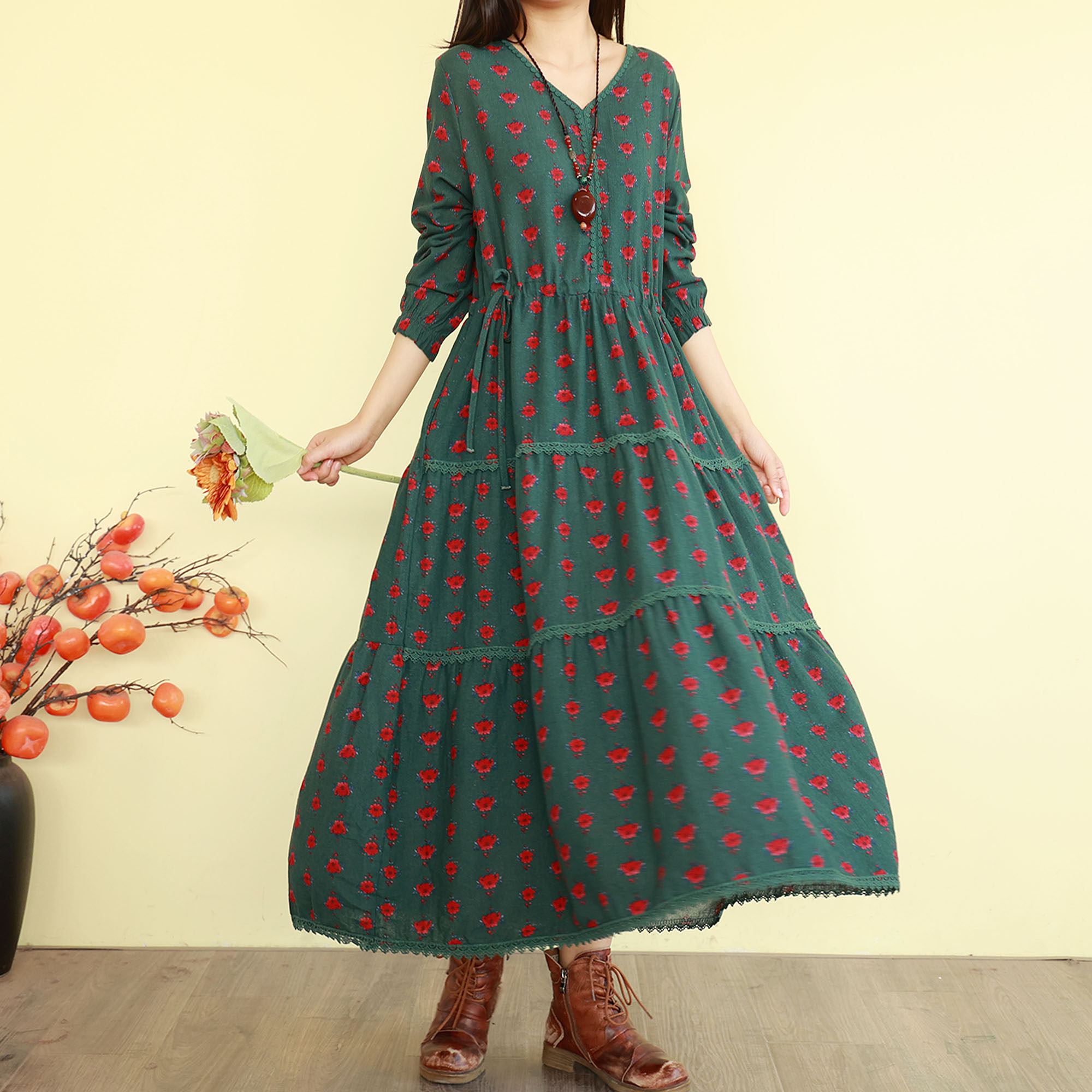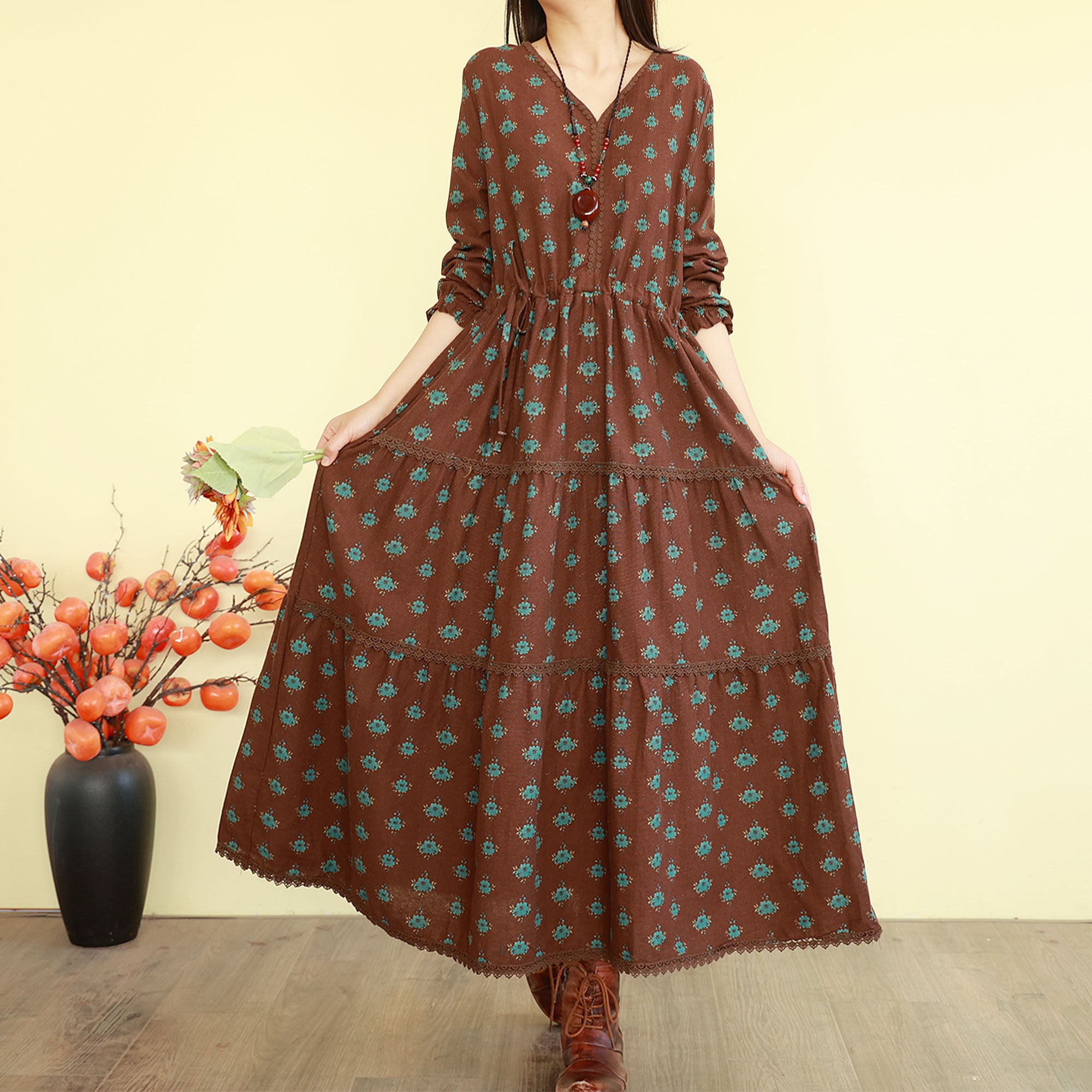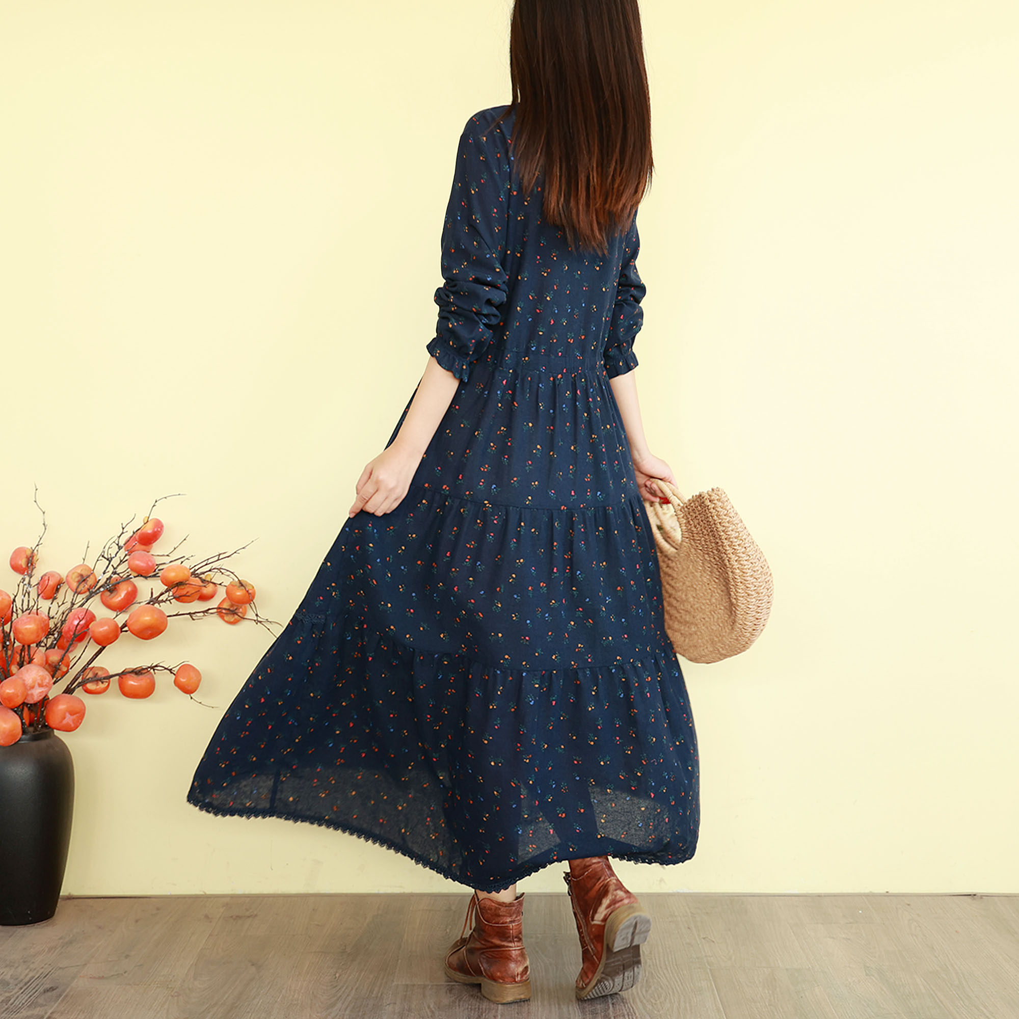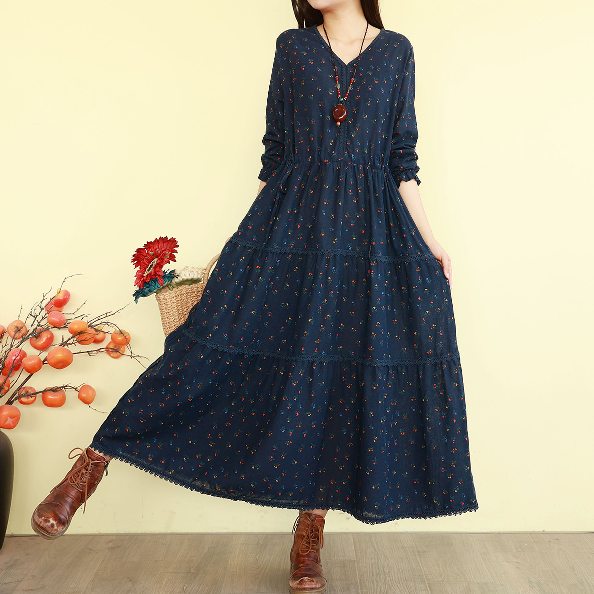 复古文艺碎花连衣裙女春季新款长袖长裙子宽松气质森系蛋糕大摆裙