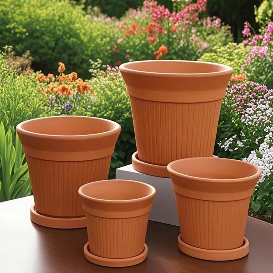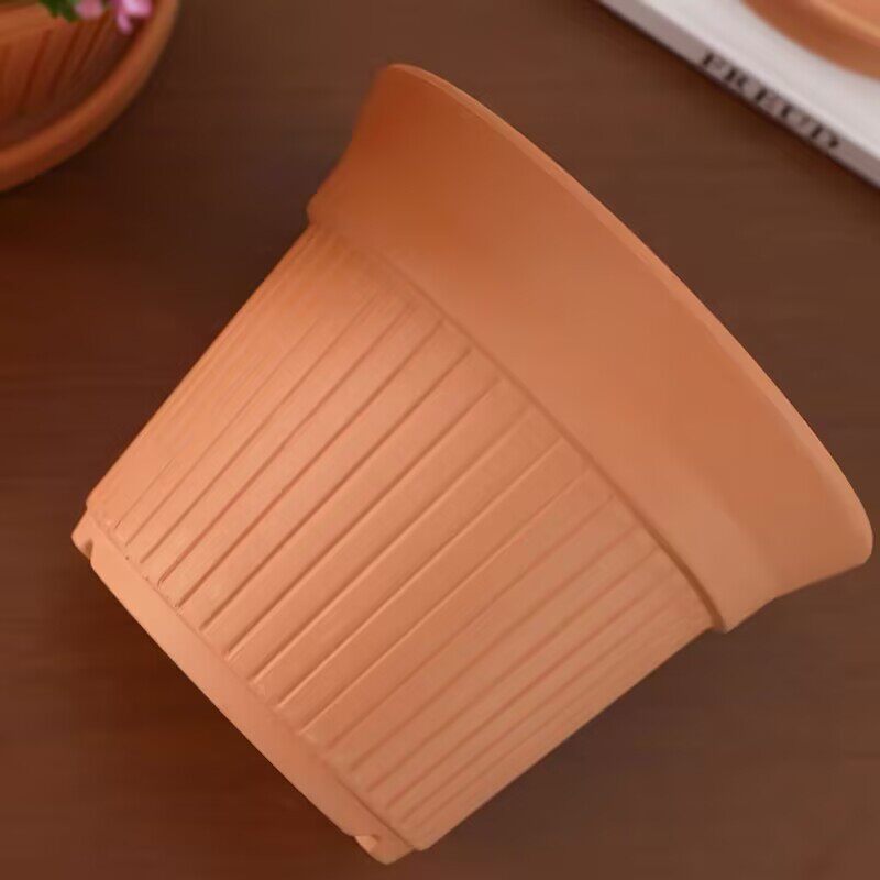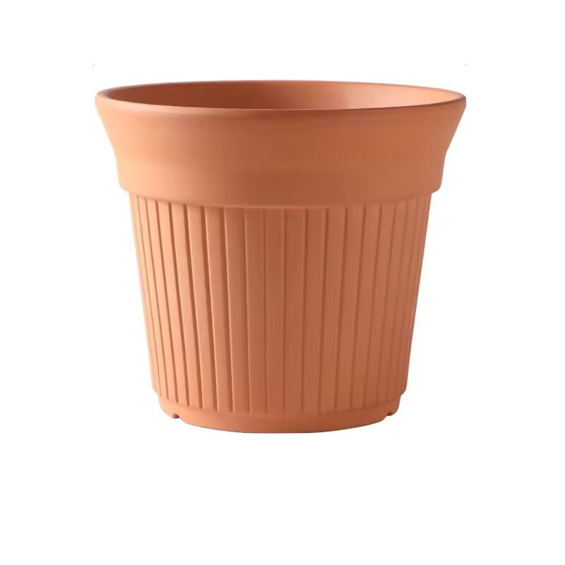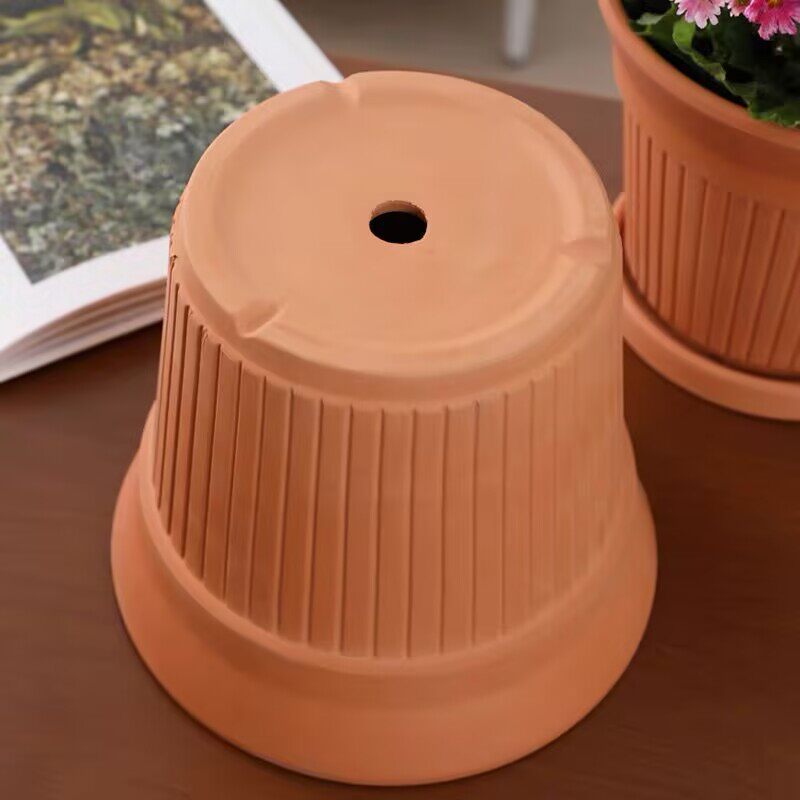 北欧风红陶花盆竖条纹简约透气花盆带托盘透气创意多肉植物盆栽