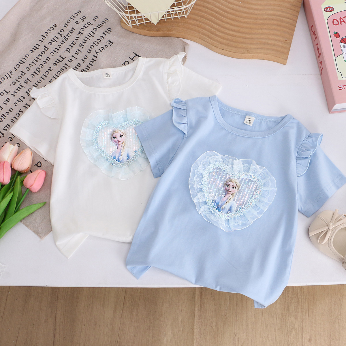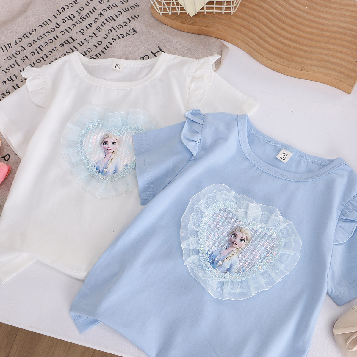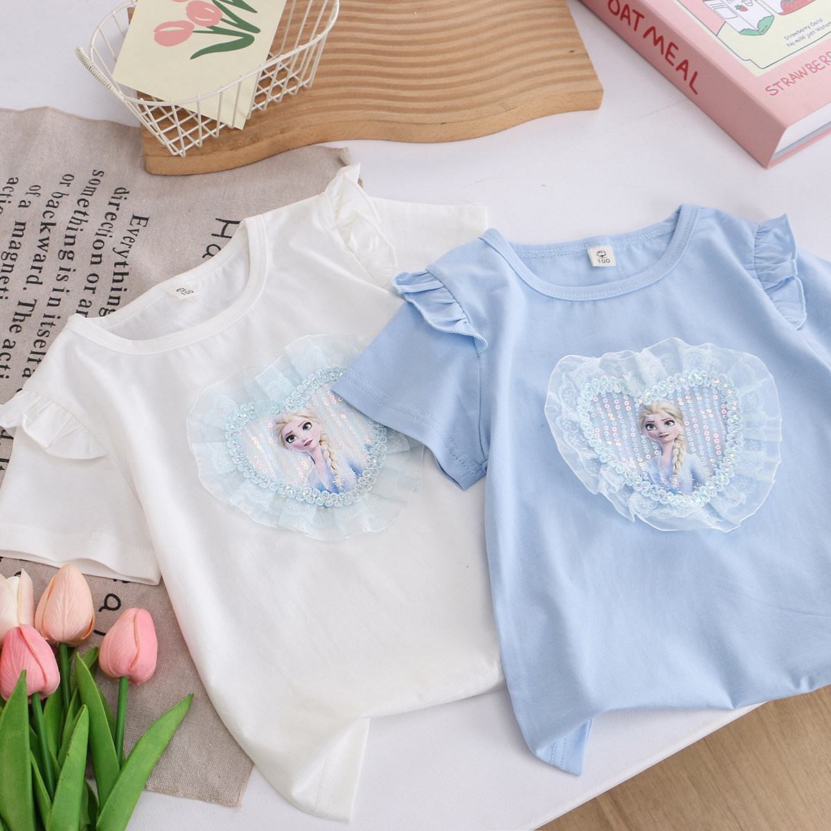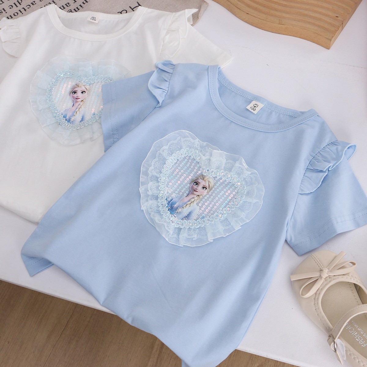 冰雪奇缘艾莎公主短袖T恤女童甜美风蕾丝花边蓝色上衣女孩半袖