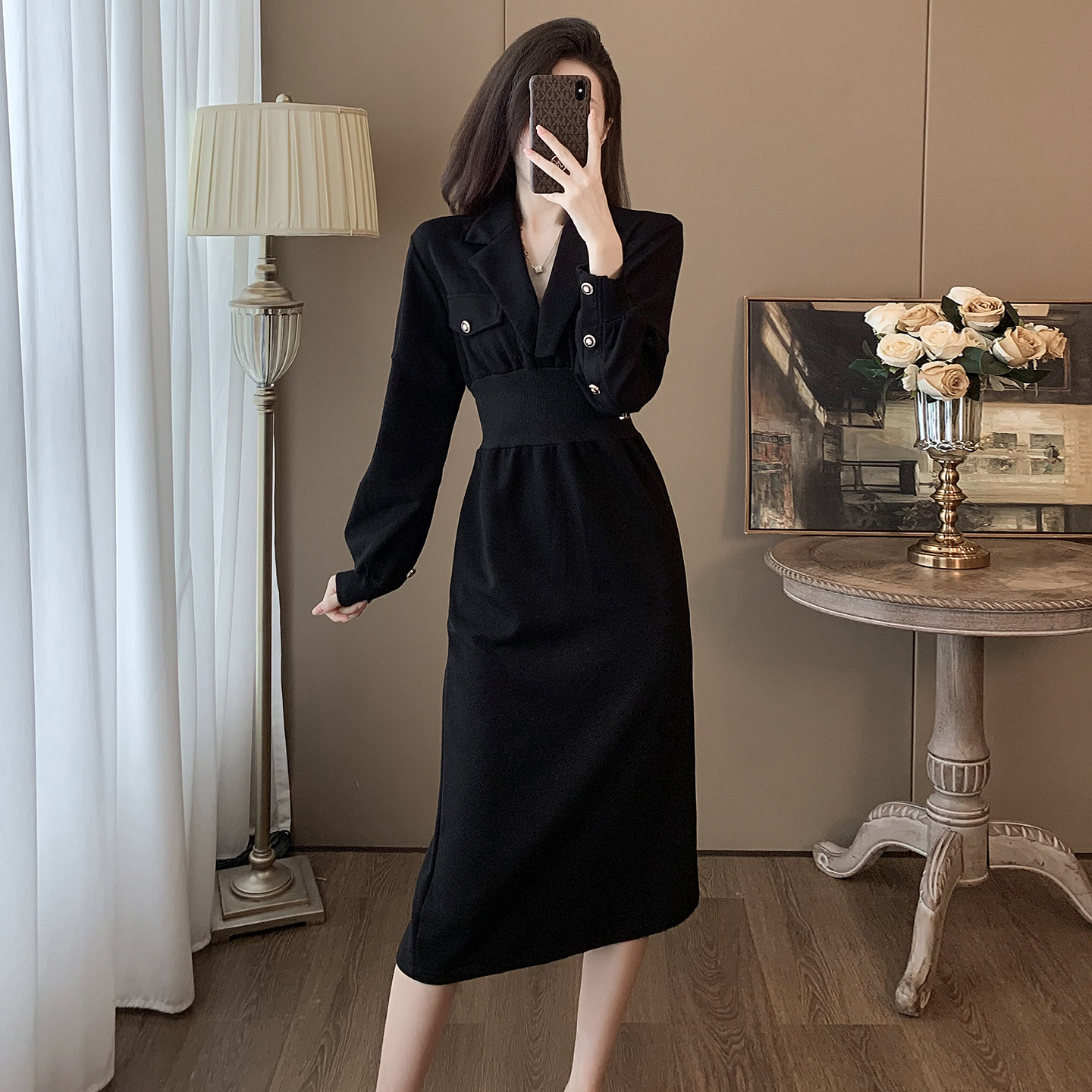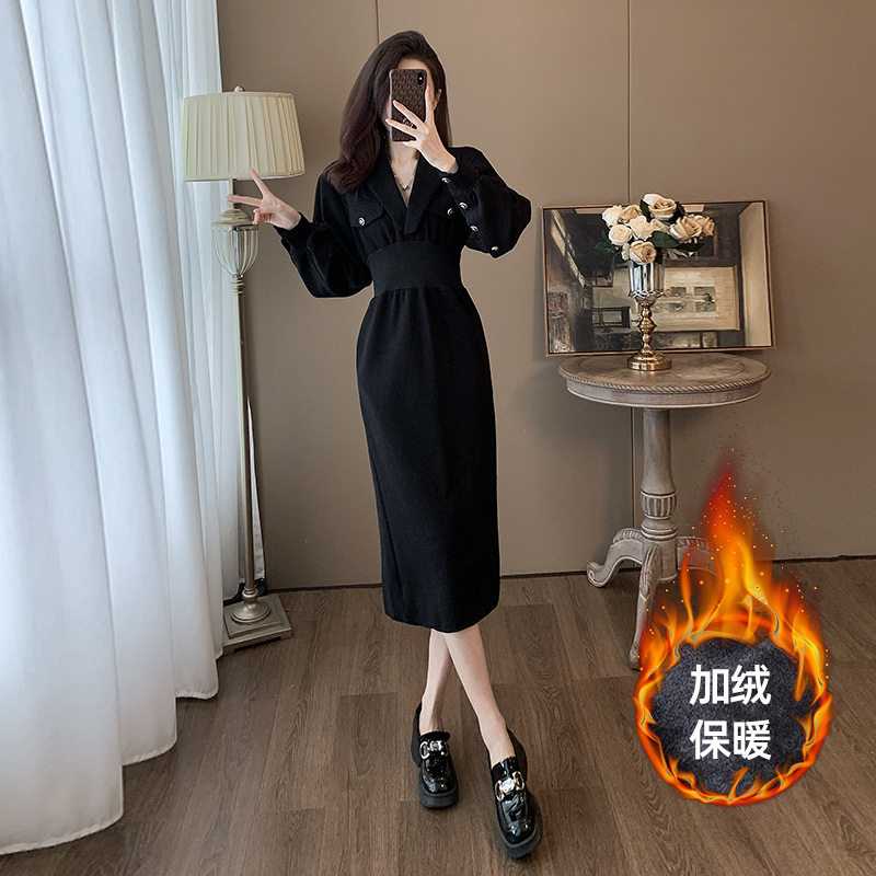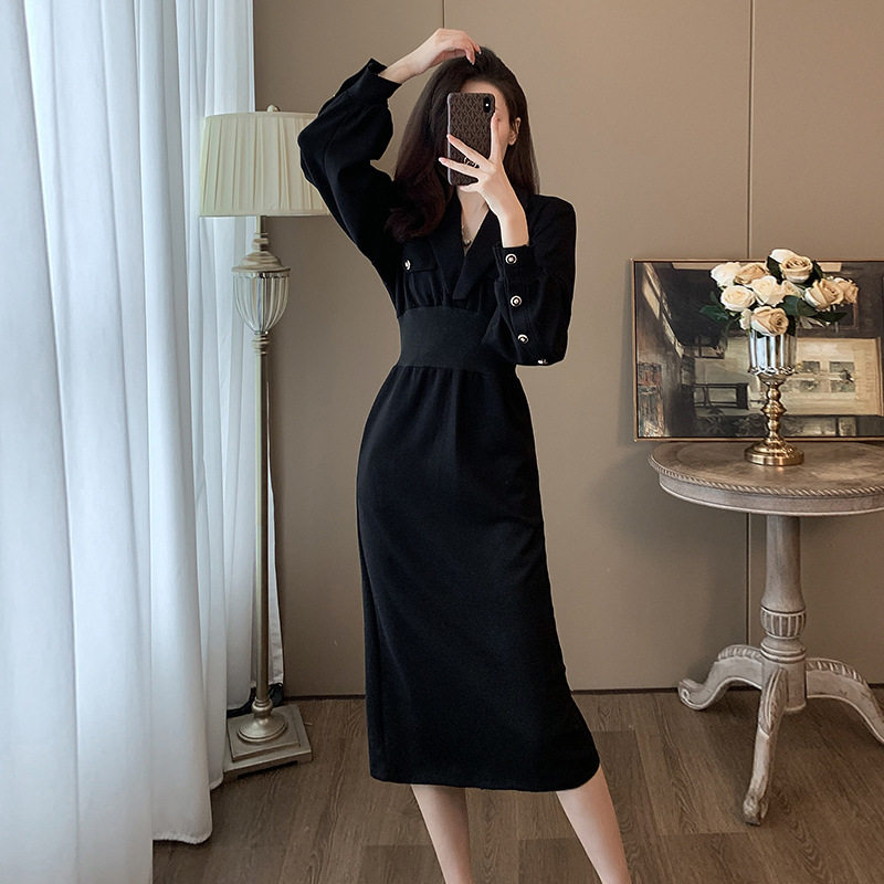 气质v领黑色连衣裙女长袖秋冬收腰法式高级感设计显瘦独特小黑裙