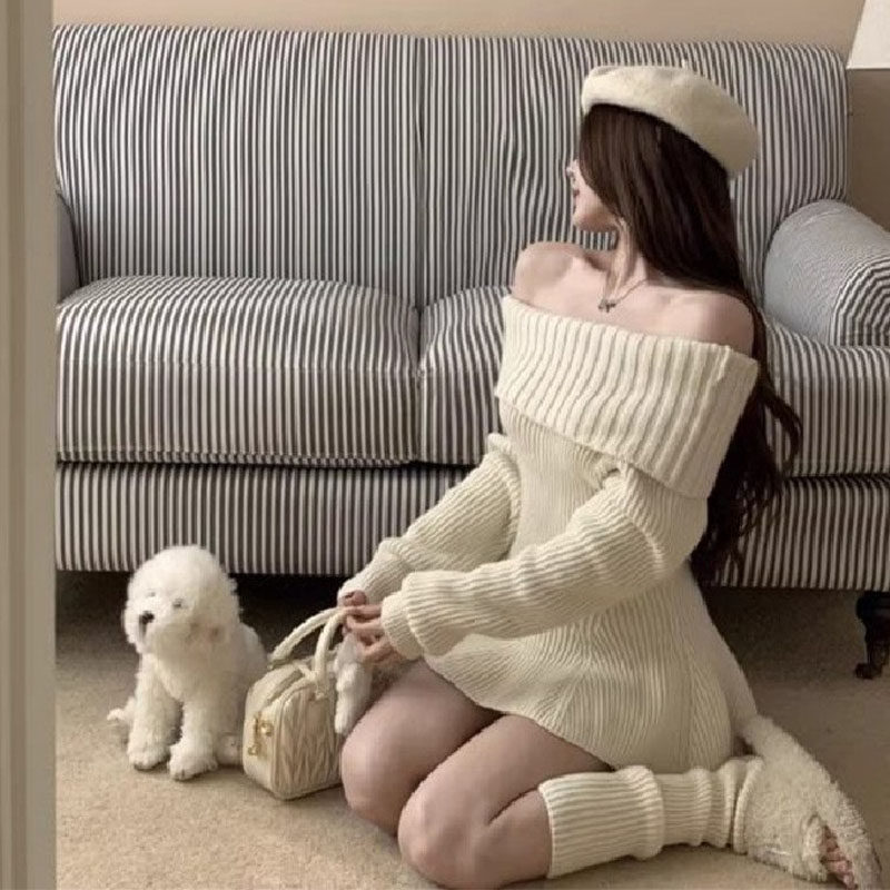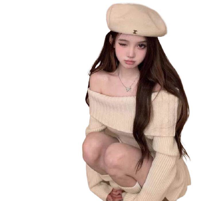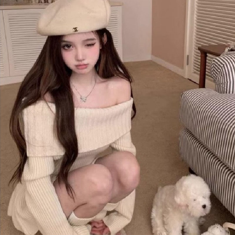 法式一字肩长袖连衣裙女2025秋冬新款慵懒风小个子长袖打底针织裙