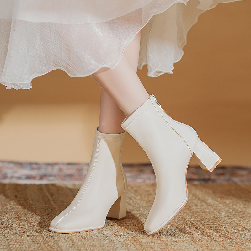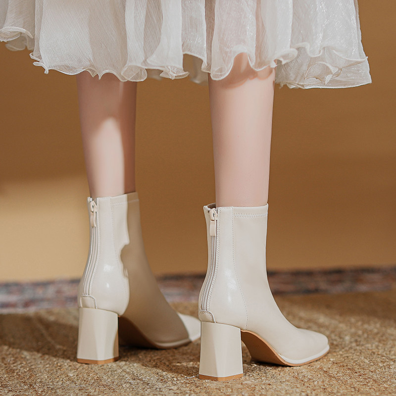 真皮粗跟高跟靴子女2026秋冬加绒新款瘦瘦靴配裙子洋气白色小短靴