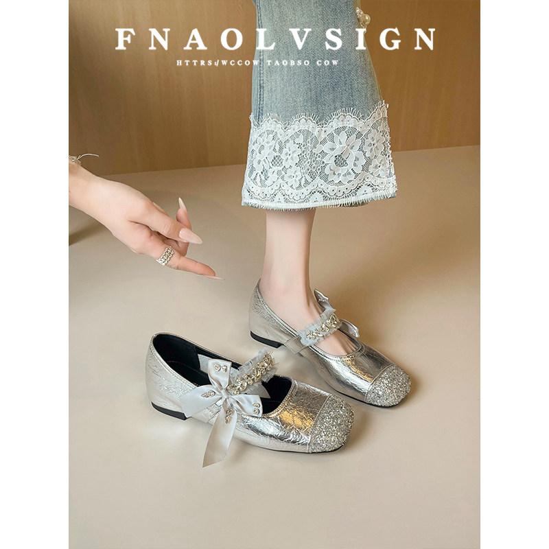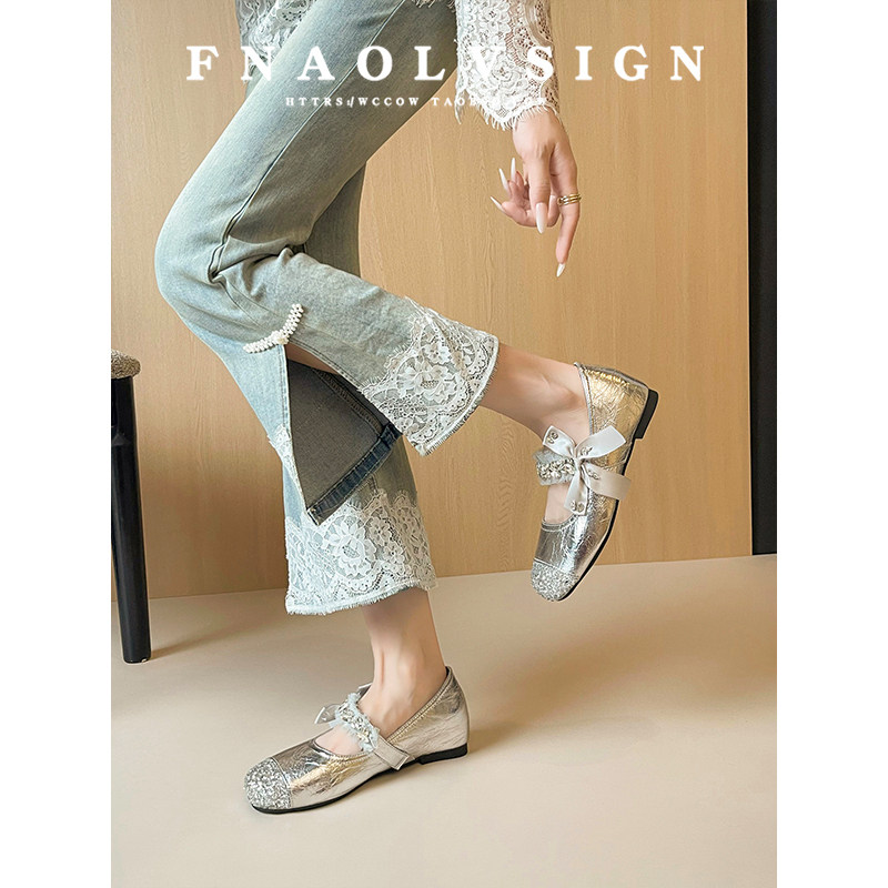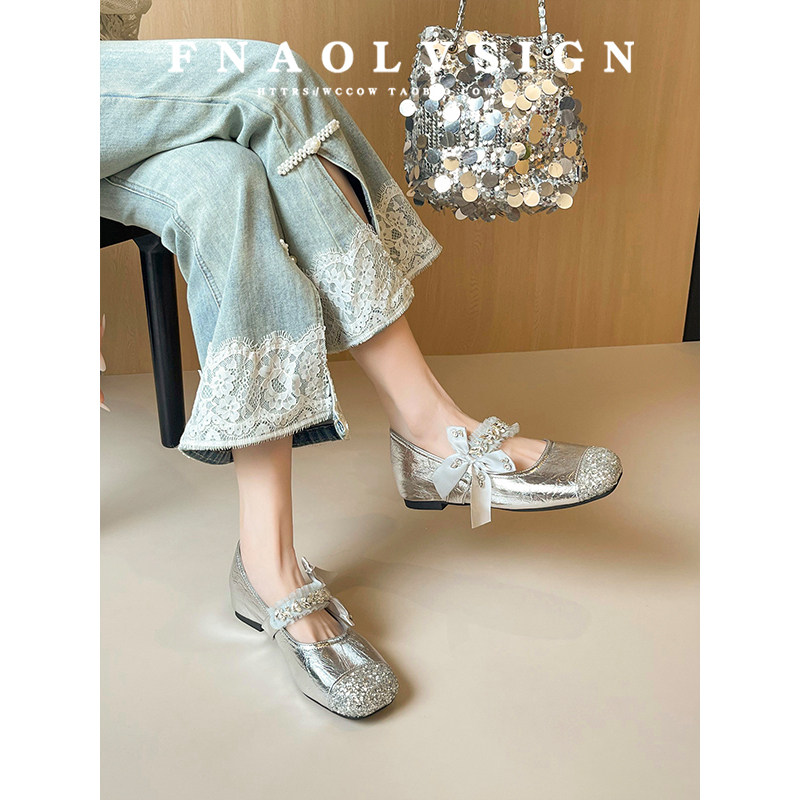 羊皮版~法式内增高玛丽珍鞋女银色蝴蝶结水钻甜美风圆头浅口单鞋