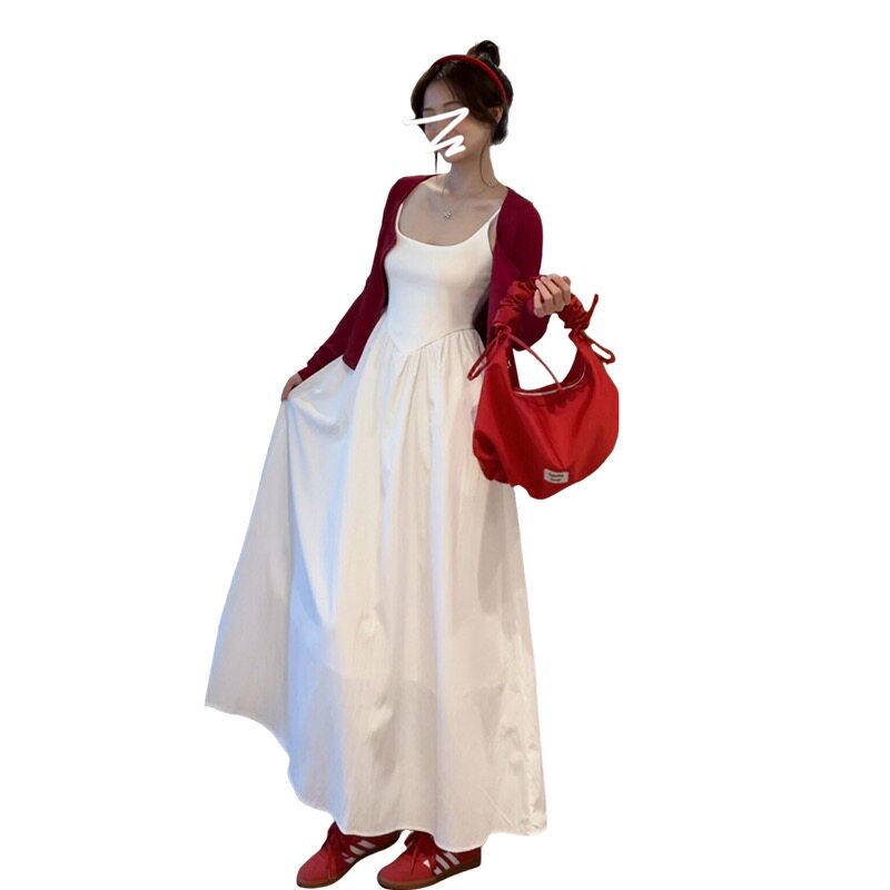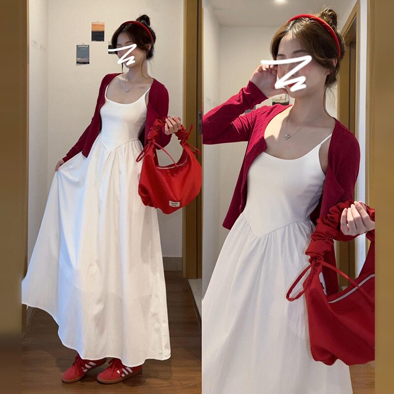 小矮个子145开春穿搭一整套150白色吊带连衣裙红色开衫套装长裙xs