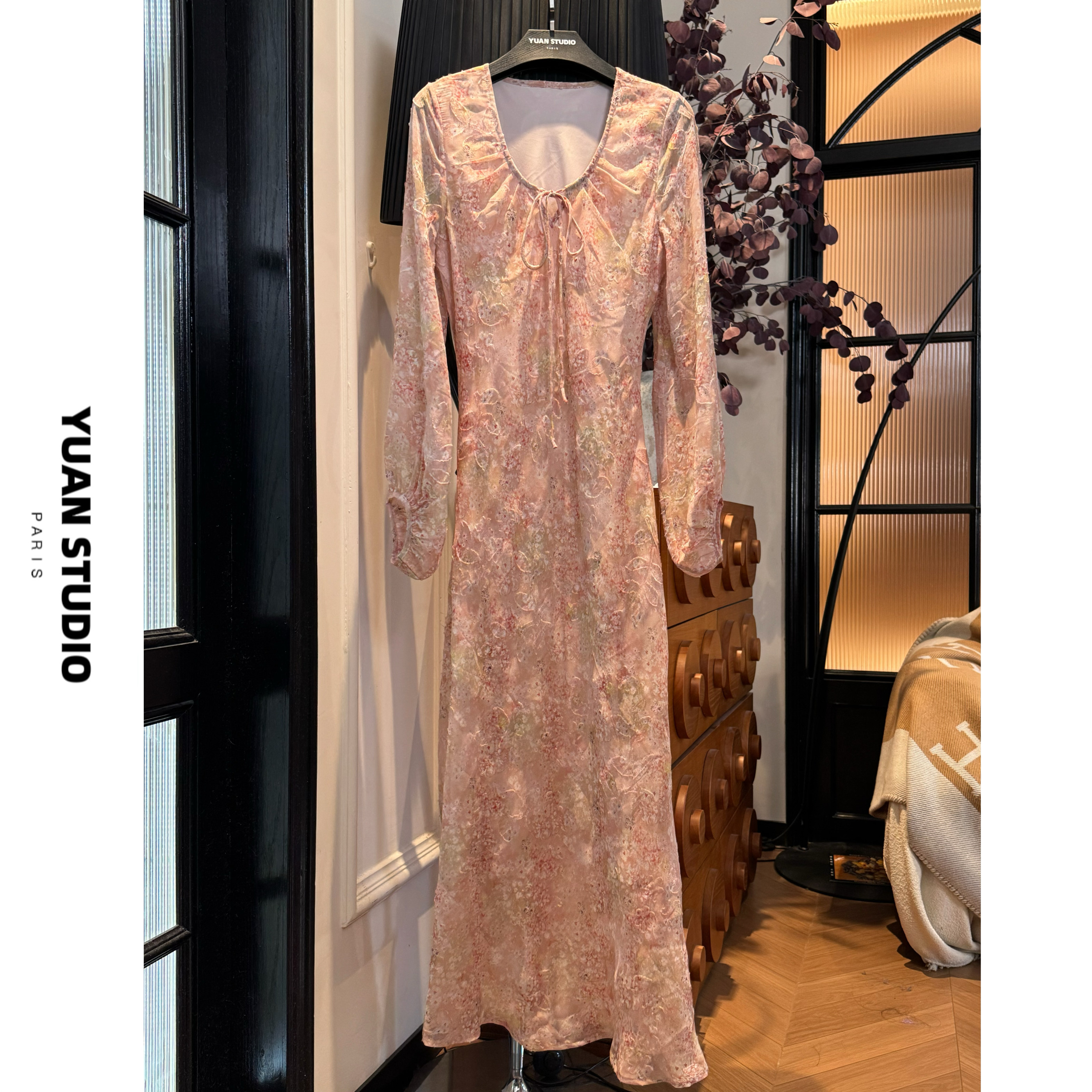 【粉雾樱野】2026春季新款法式复古气质收腰显瘦长袖连衣裙女