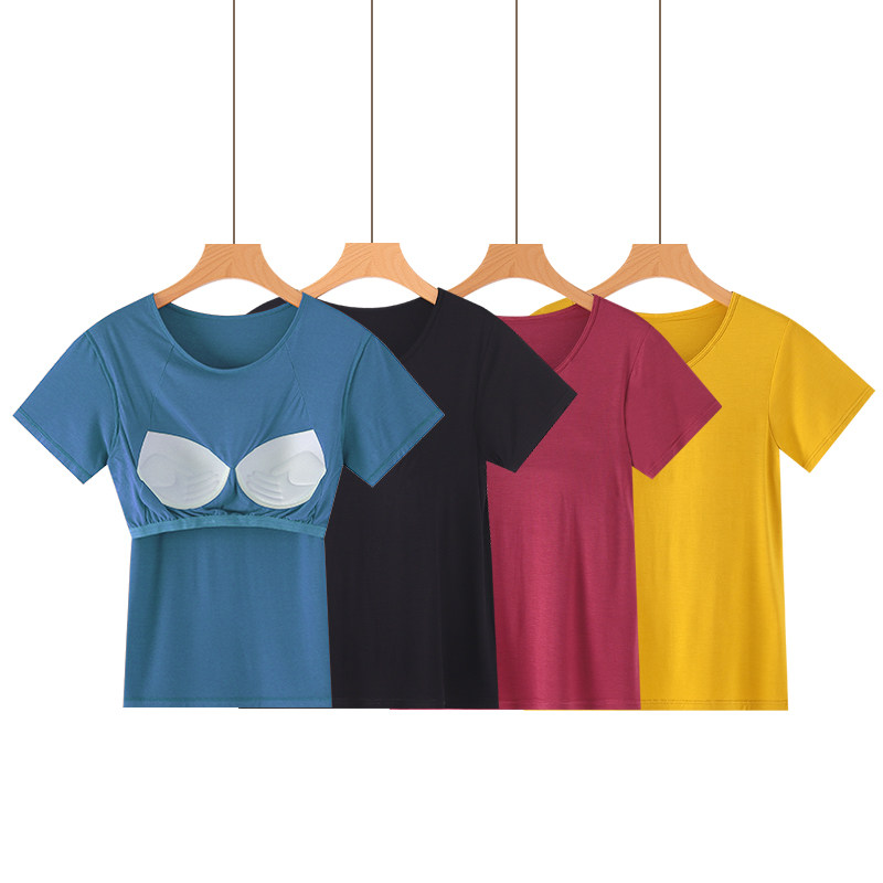 春夏新款莫代尔纯色带胸垫短袖T恤上衣瑜伽宽松家居薄睡衣可外穿