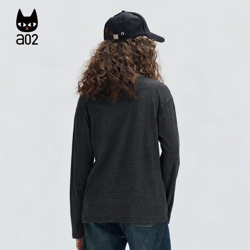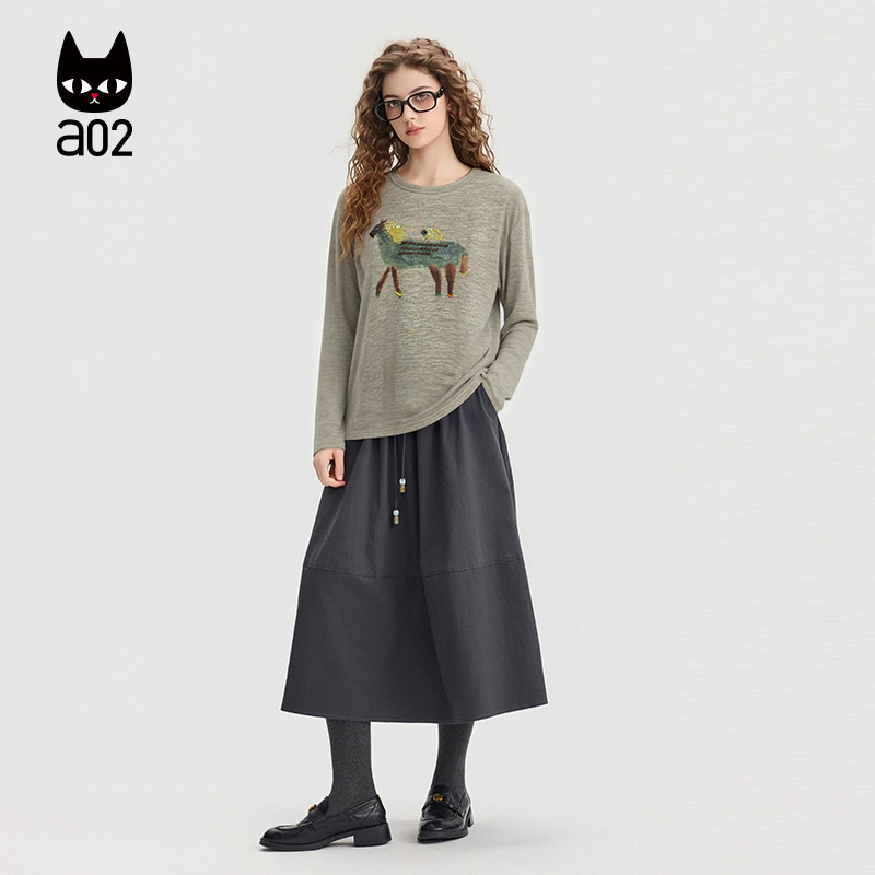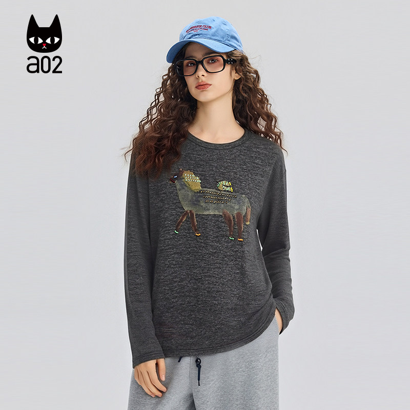 a02黑猫系列马年天丝圆领长袖T恤女款2026新款春秋打底衫内搭上衣