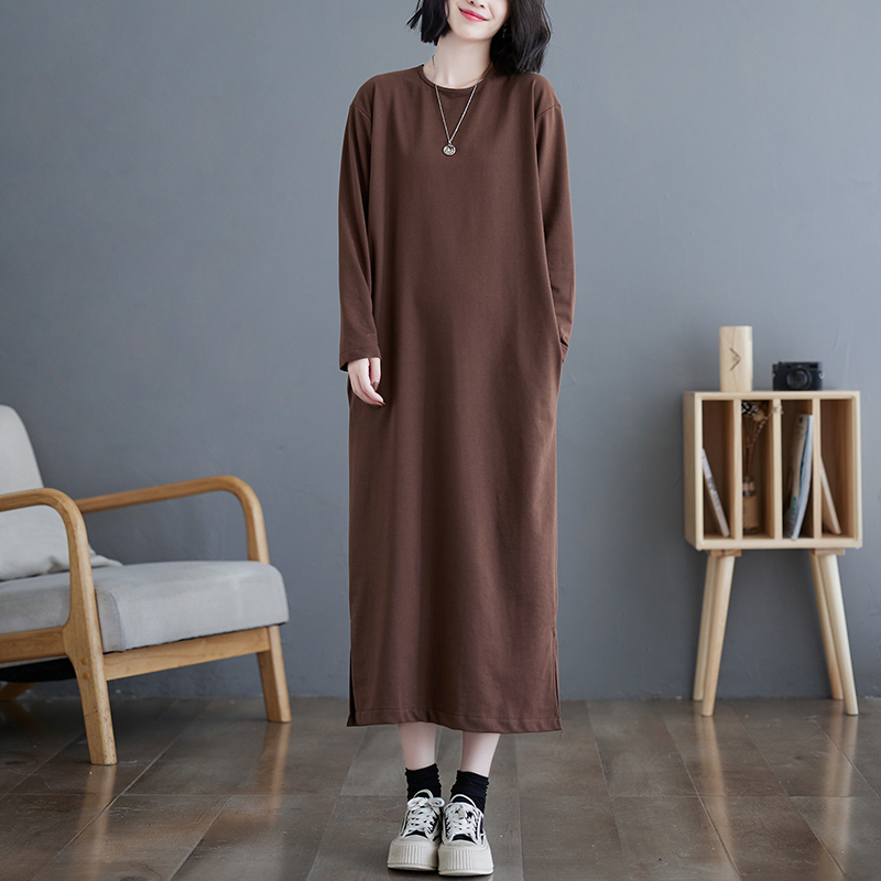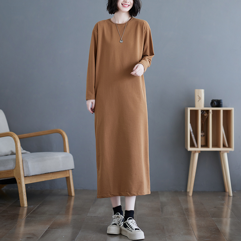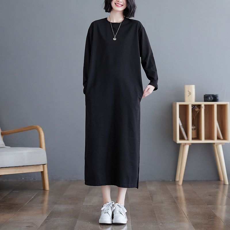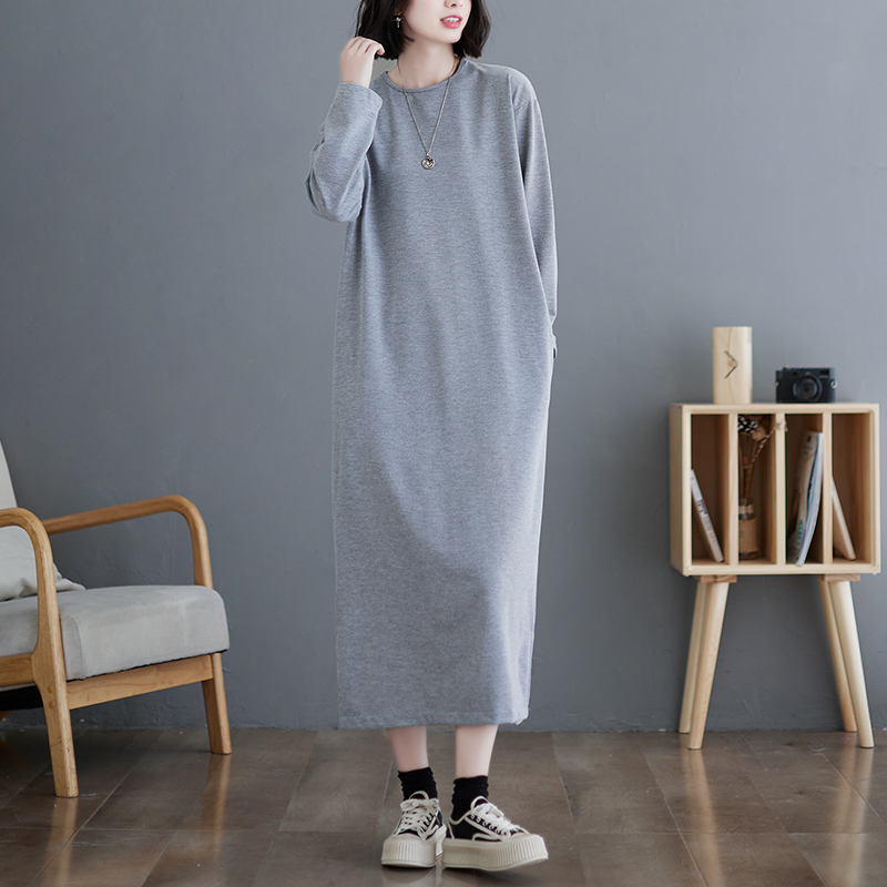 长款过膝t恤裙女秋冬新款大码宽松显瘦休闲长袖纯色打底连衣裙子