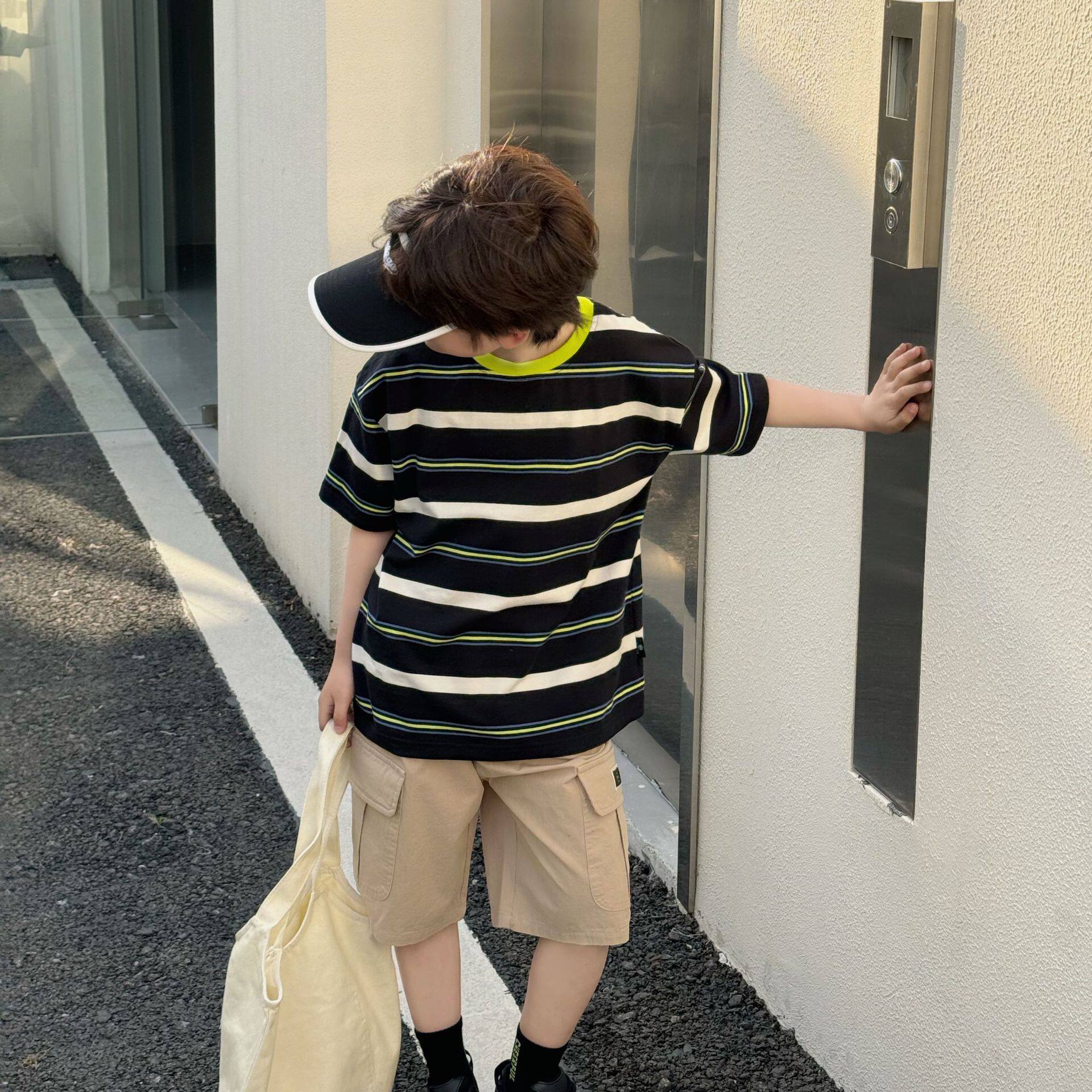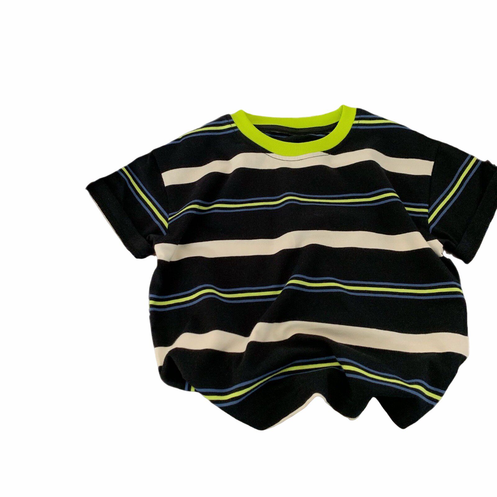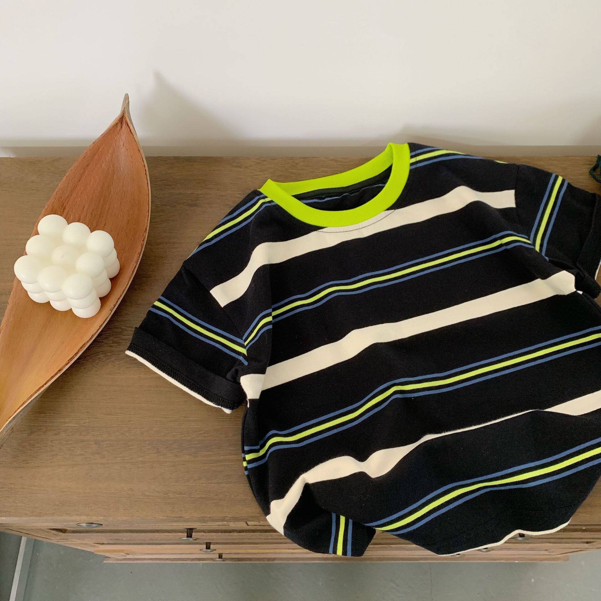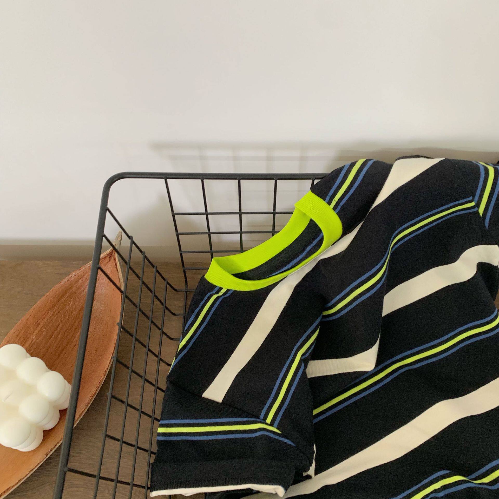 韩范新款男童荧光绿领条纹短袖T恤夏季儿童宝宝洋气时尚拼色上衣