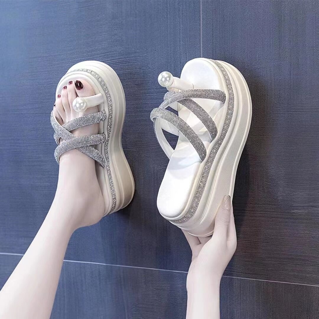 夏天拖鞋女款外穿2026真皮厚底坡跟高跟增高松糕鞋水钻夹趾凉拖