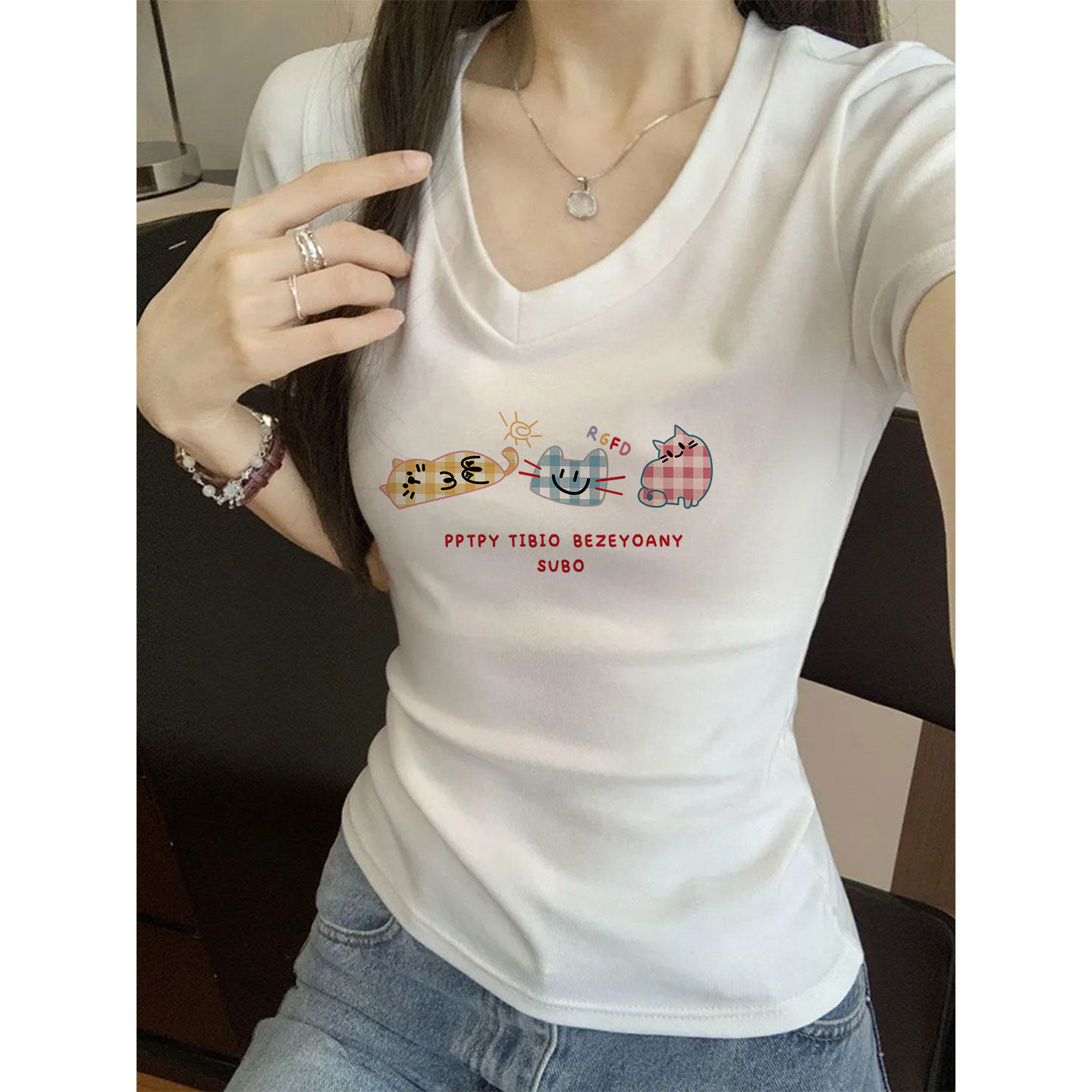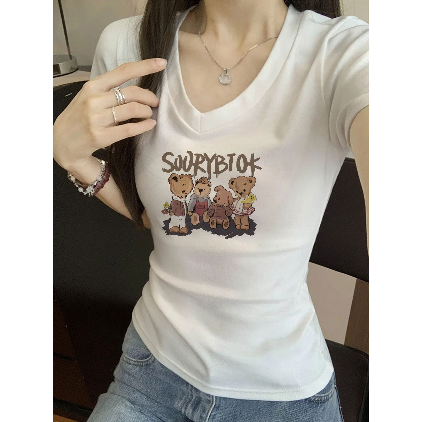 白色修身显瘦短袖t恤女装2026新款今年流行爆款v领上衣小众设计感
