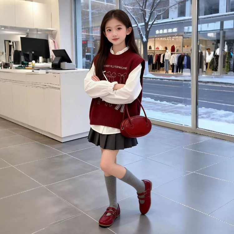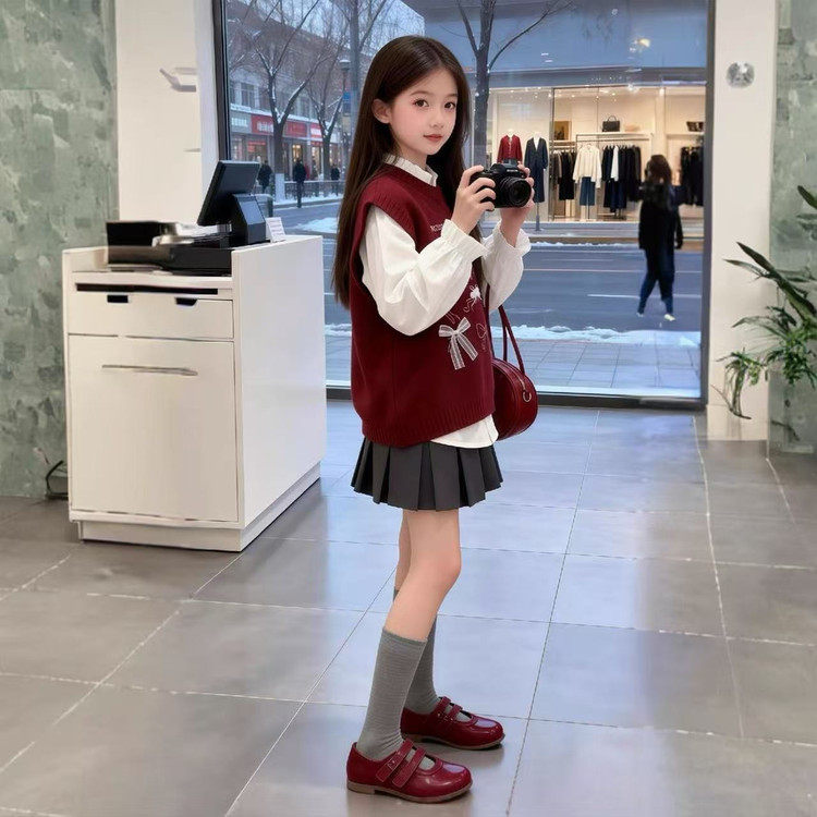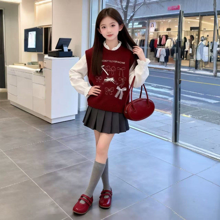 女童套装春装2026新款中大童女童春款蝴蝶结马甲衬衫套装初中生