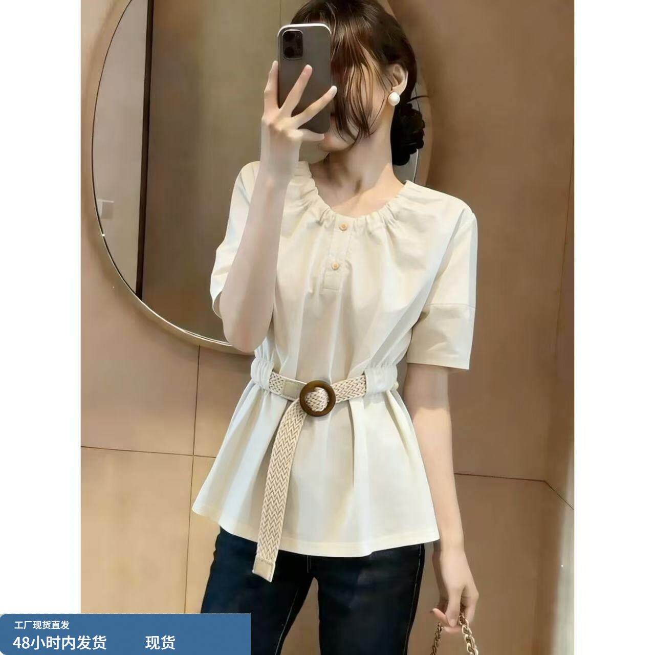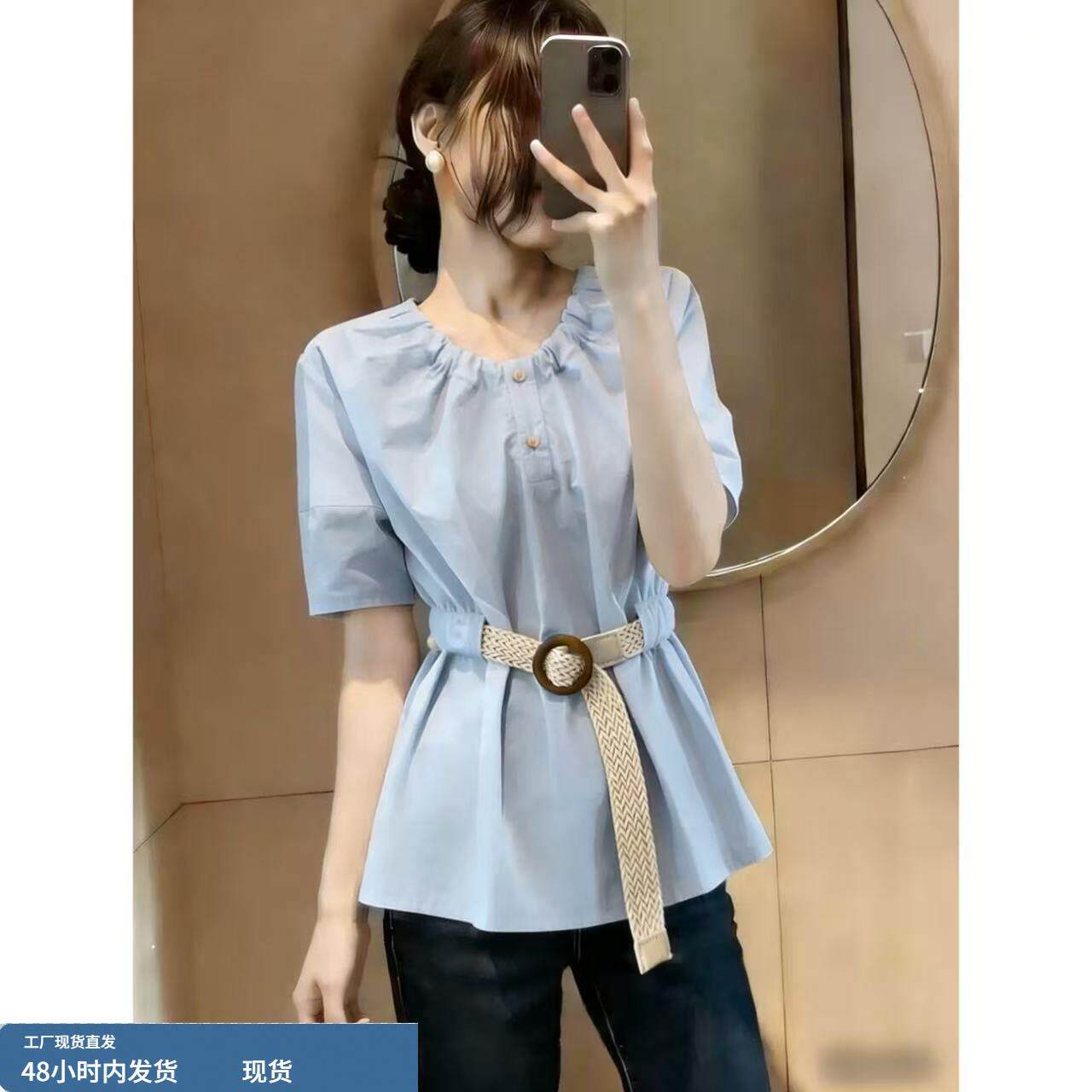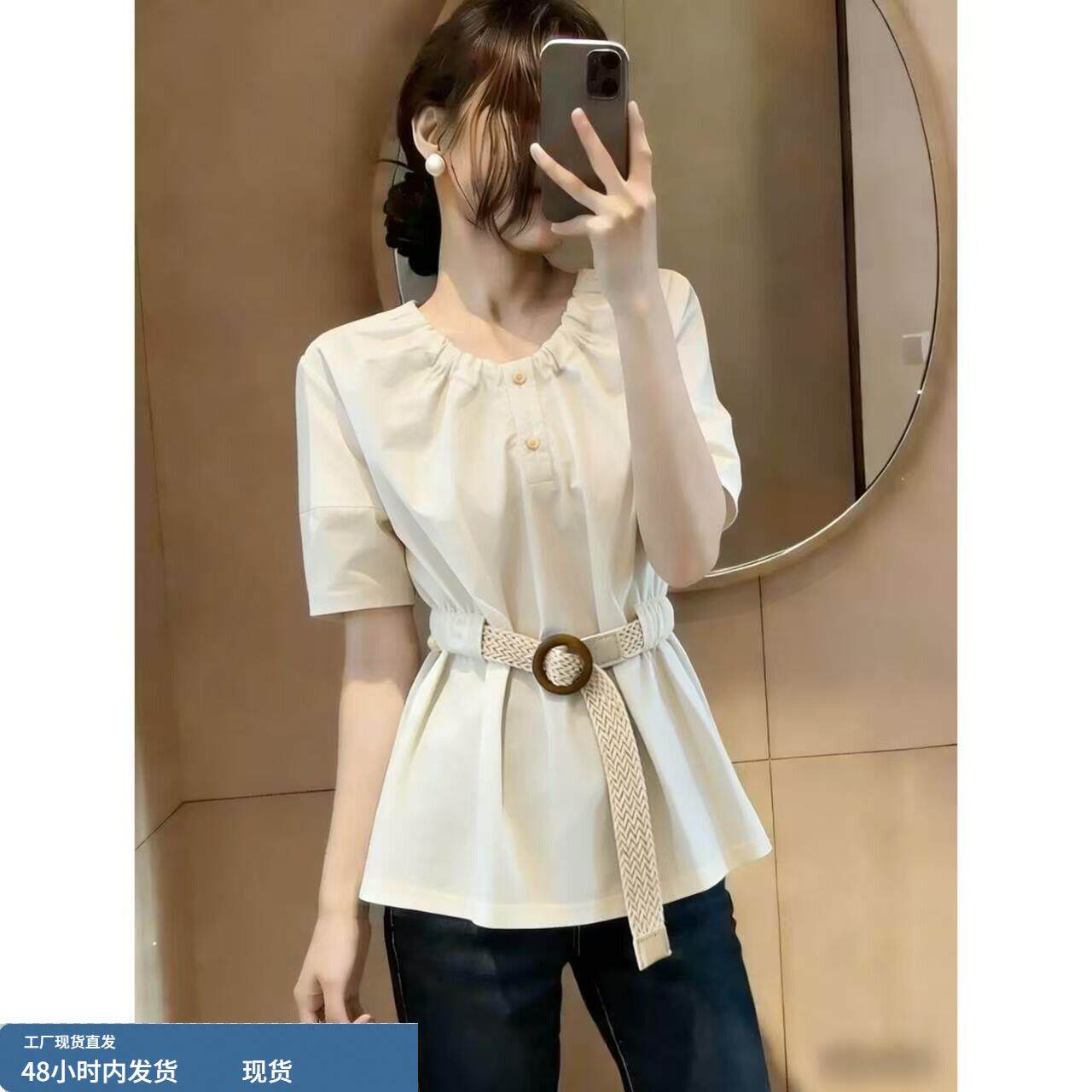 短袖衬衫女款2026夏季新款V领收腰巨好看显瘦遮肚子大码胖mm上衣