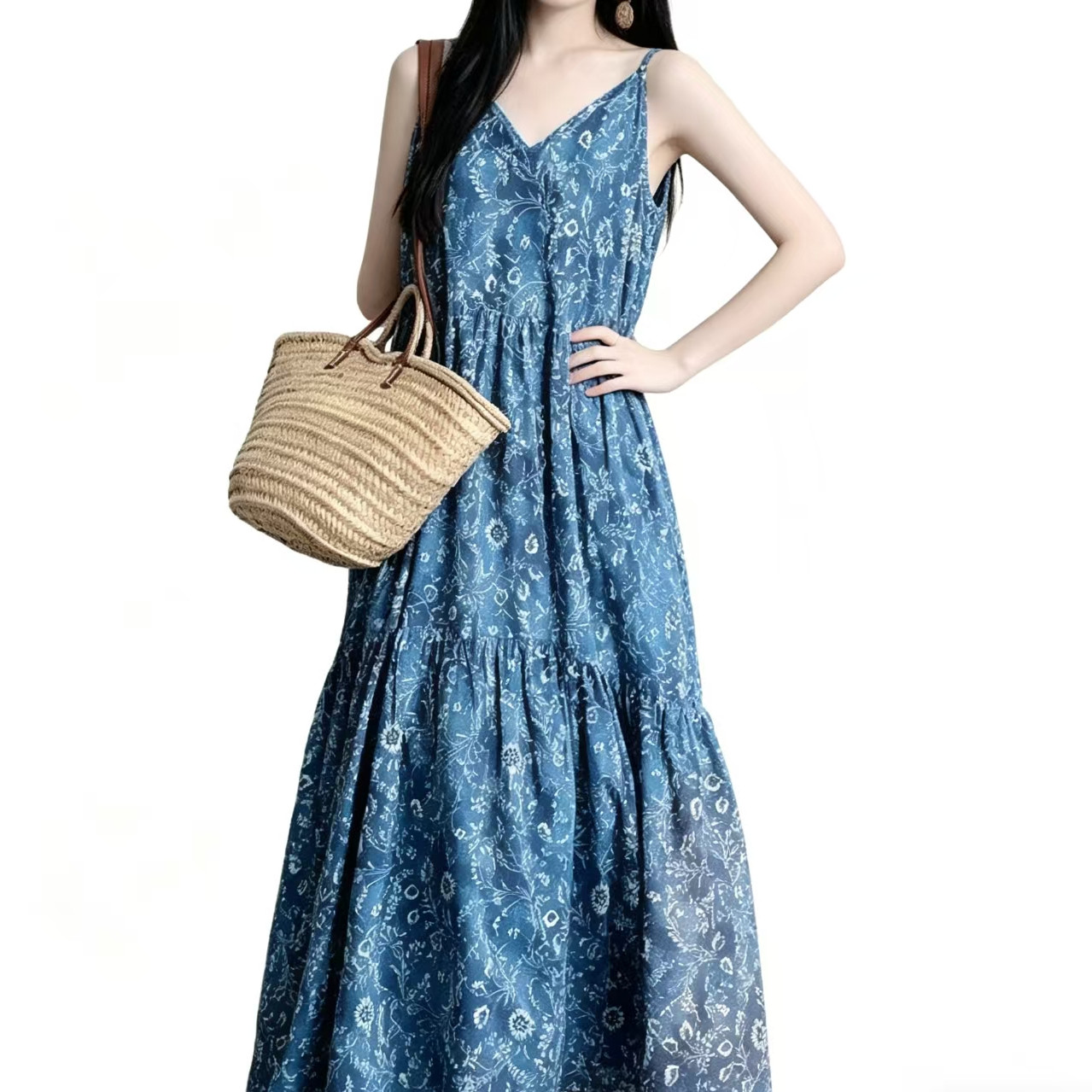 韩系碎花吊带连衣裙V领夏季大码胖mm宽松显瘦海边度假风大摆裙子
