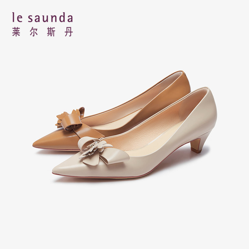 莱尔斯丹春夏新款时尚优雅尖头饰花通勤中跟女鞋单鞋5M43304