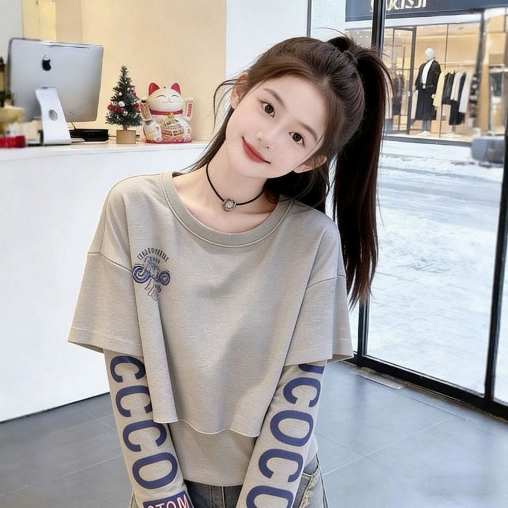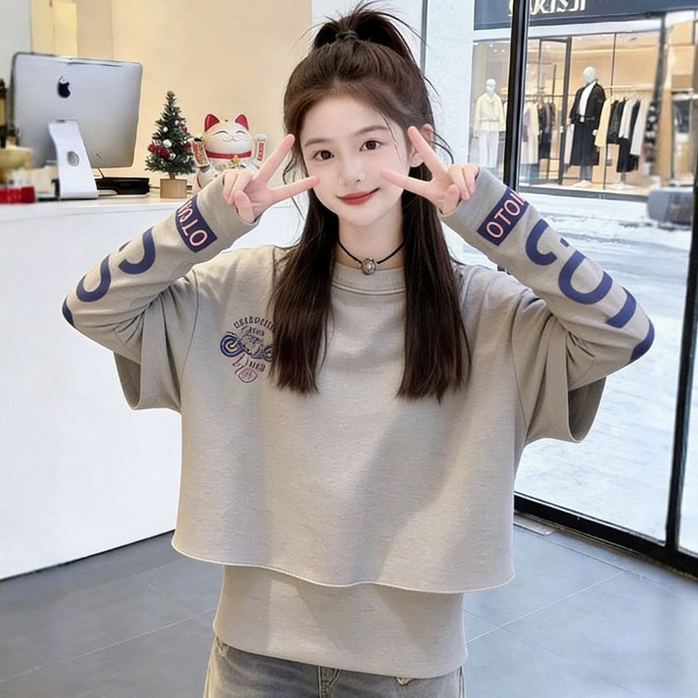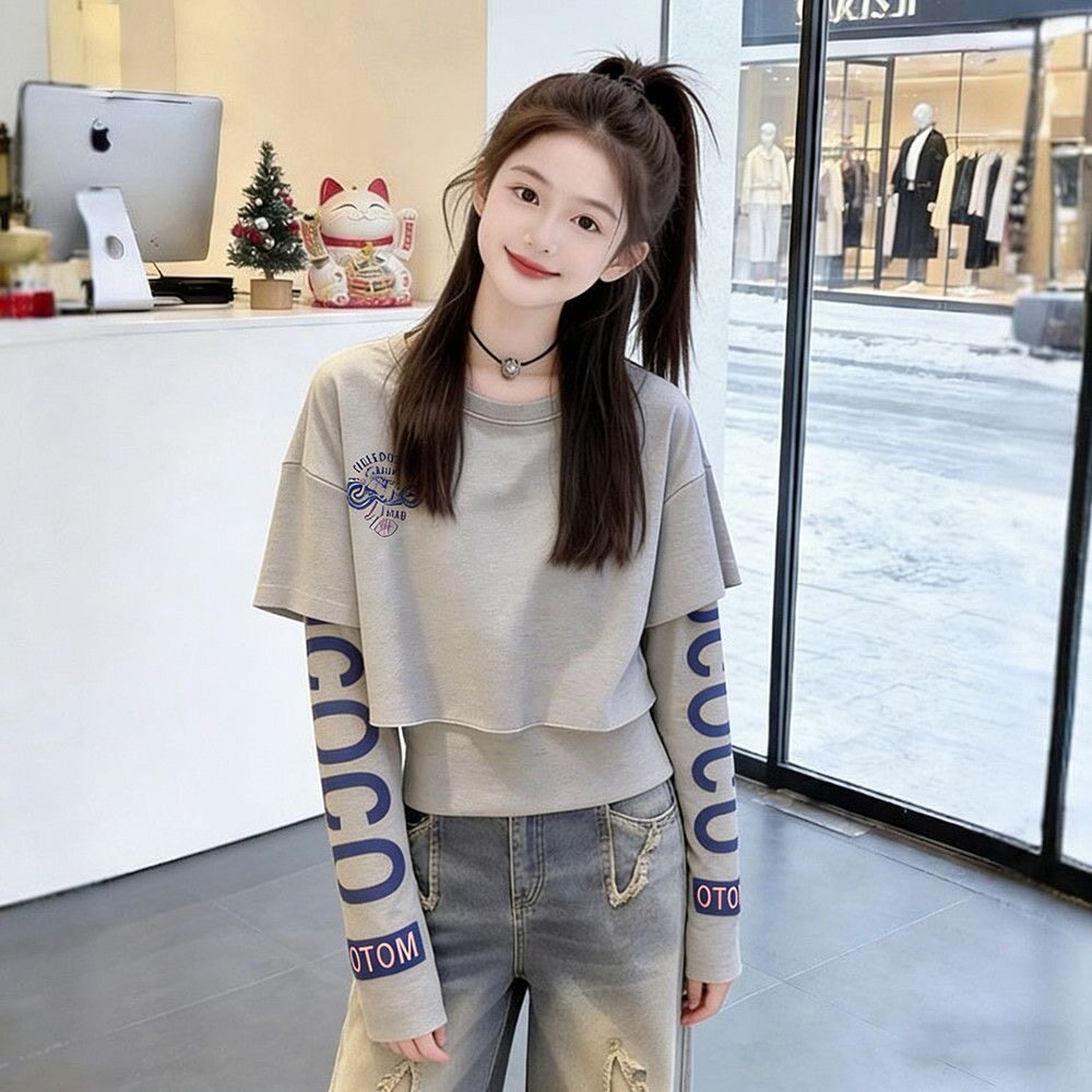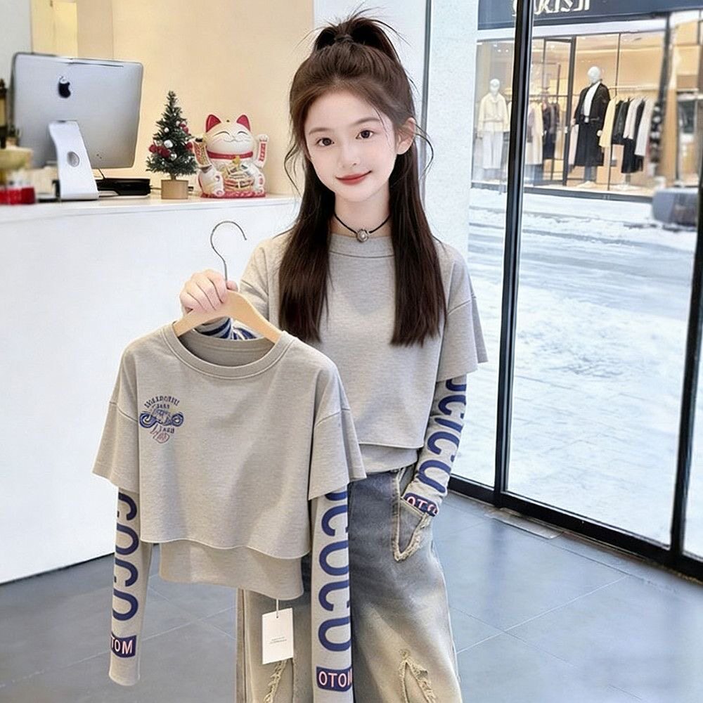 女童长袖T恤2026春秋圆领假两件儿童洋气时髦中大童上衣打底衫潮