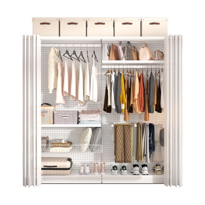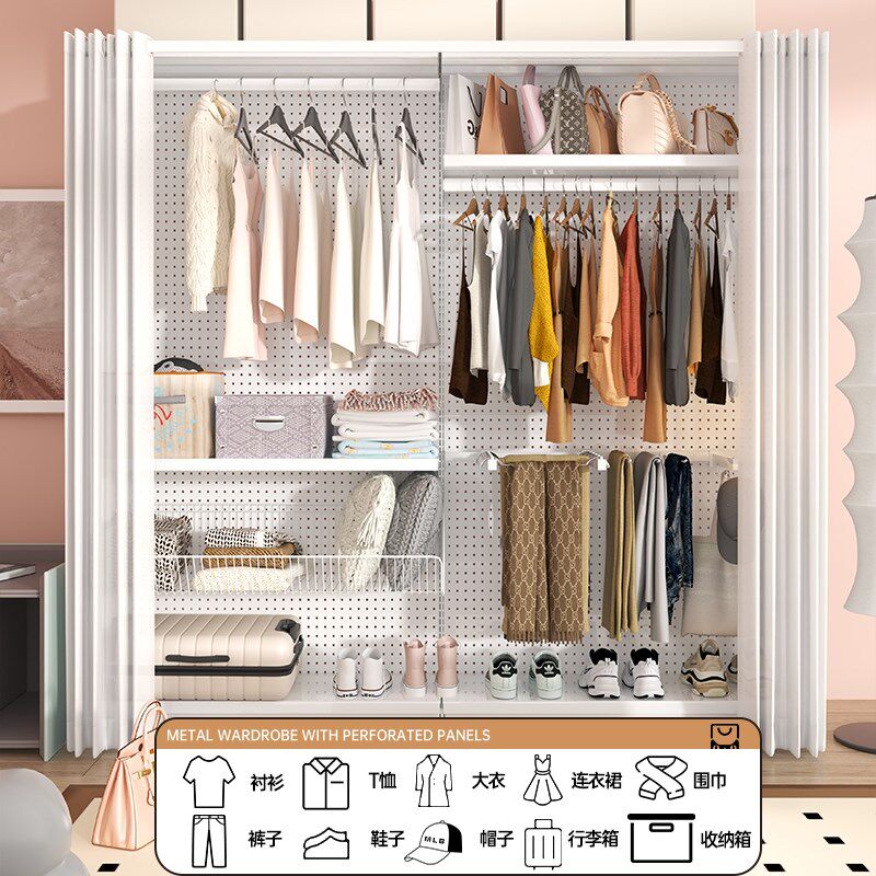 洞洞板简易五金衣柜金属带防尘帘家用卧室开放式衣橱衣帽间少女