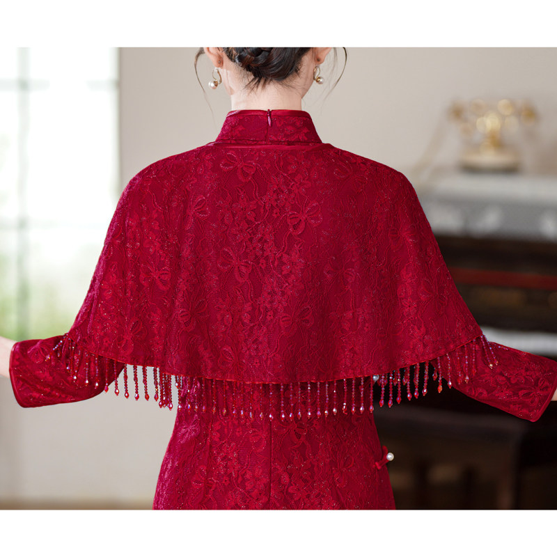 妈妈婚礼旗袍红蕾丝年轻改良连衣裙小个子2件套7分长袖秋装高级感