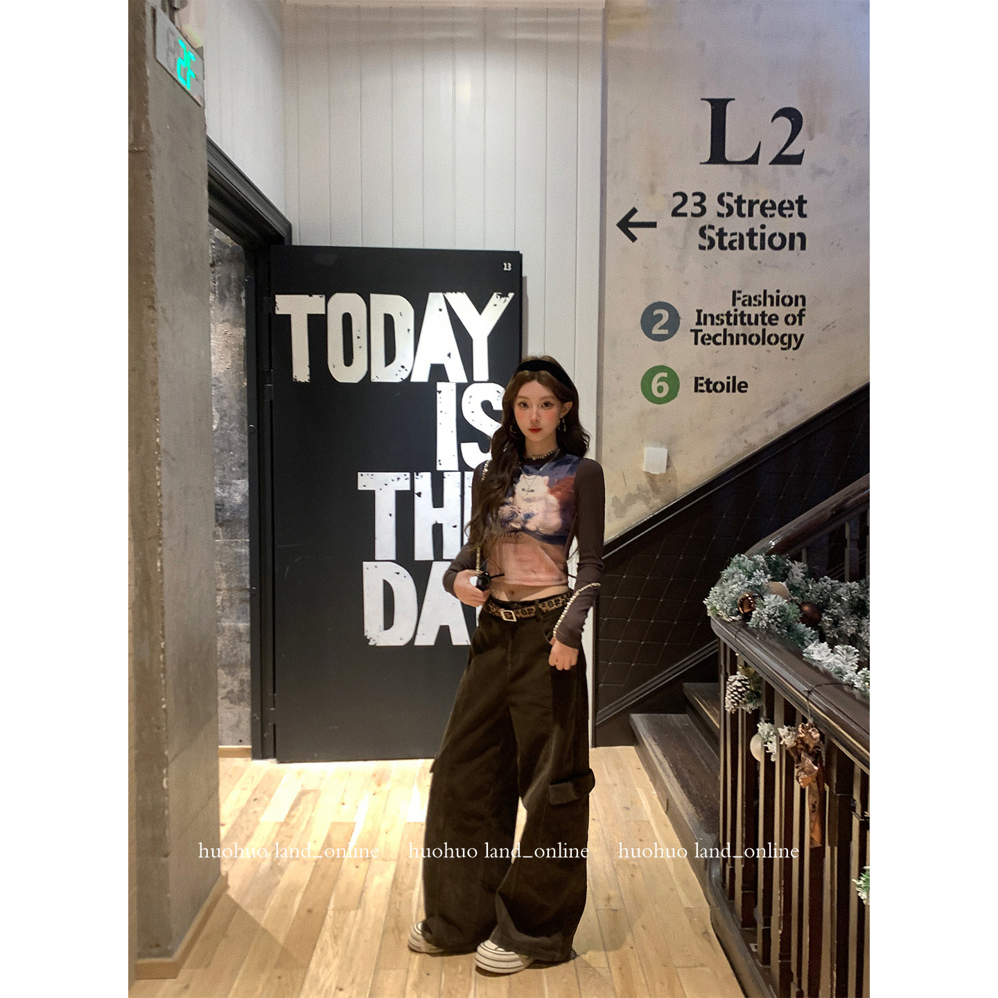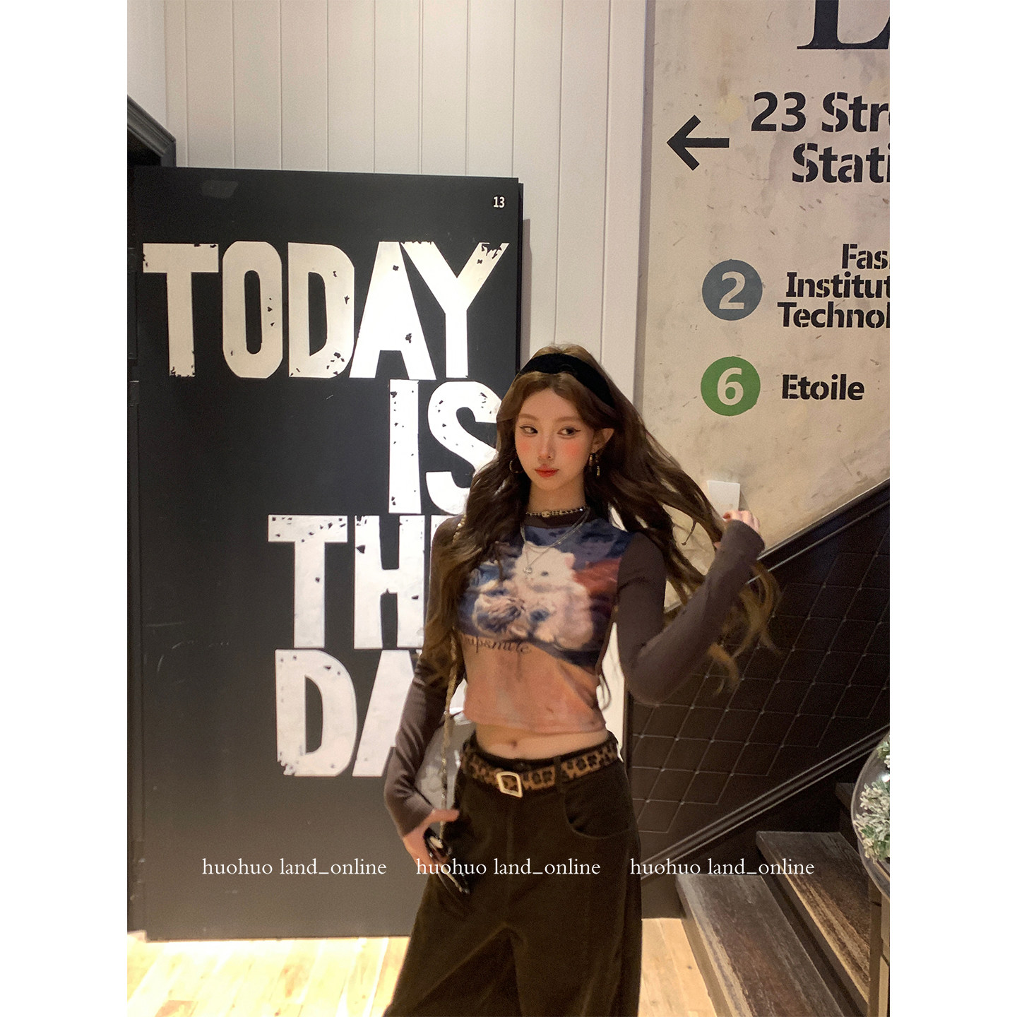 HuoHuo 喵喵心事 2026春夏季新款上衣女正肩修身印花圆领长袖T恤