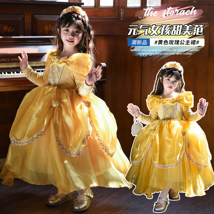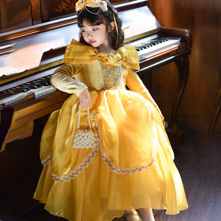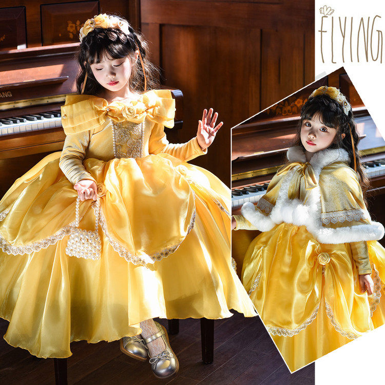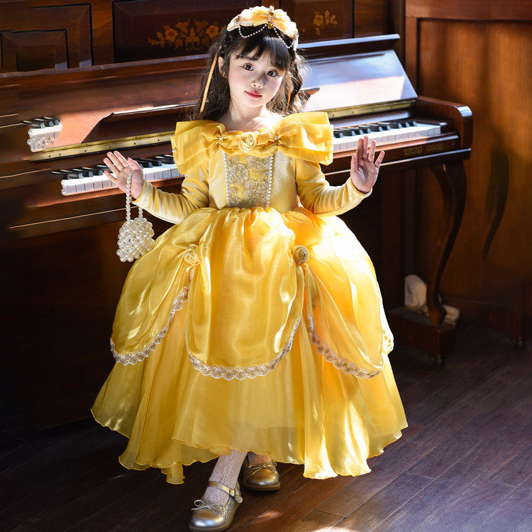 2026透气薄款女童黄色公主连衣裙长袖宫廷风华丽蛋糕裙生日礼服裙