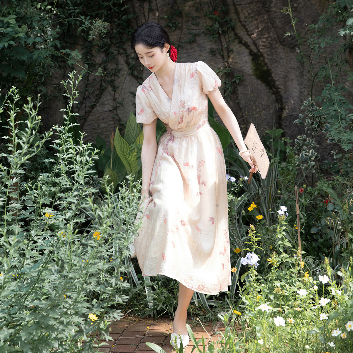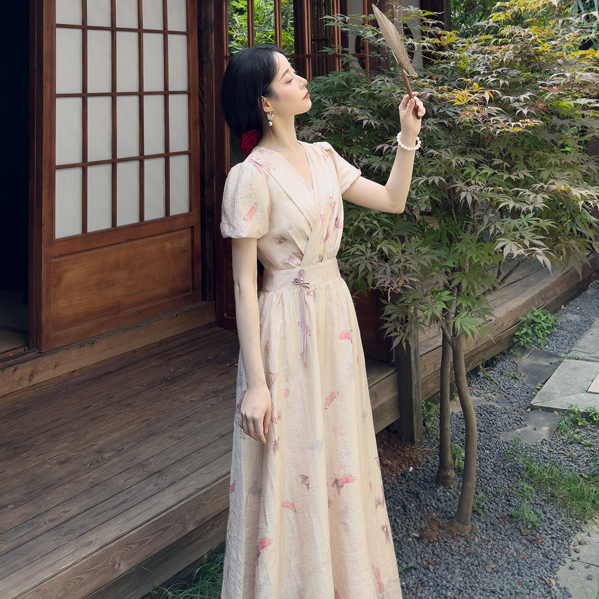 如念|新中式天丝提花国风交领日常通勤连衣裙蝴蝶印花短袖长裙夏