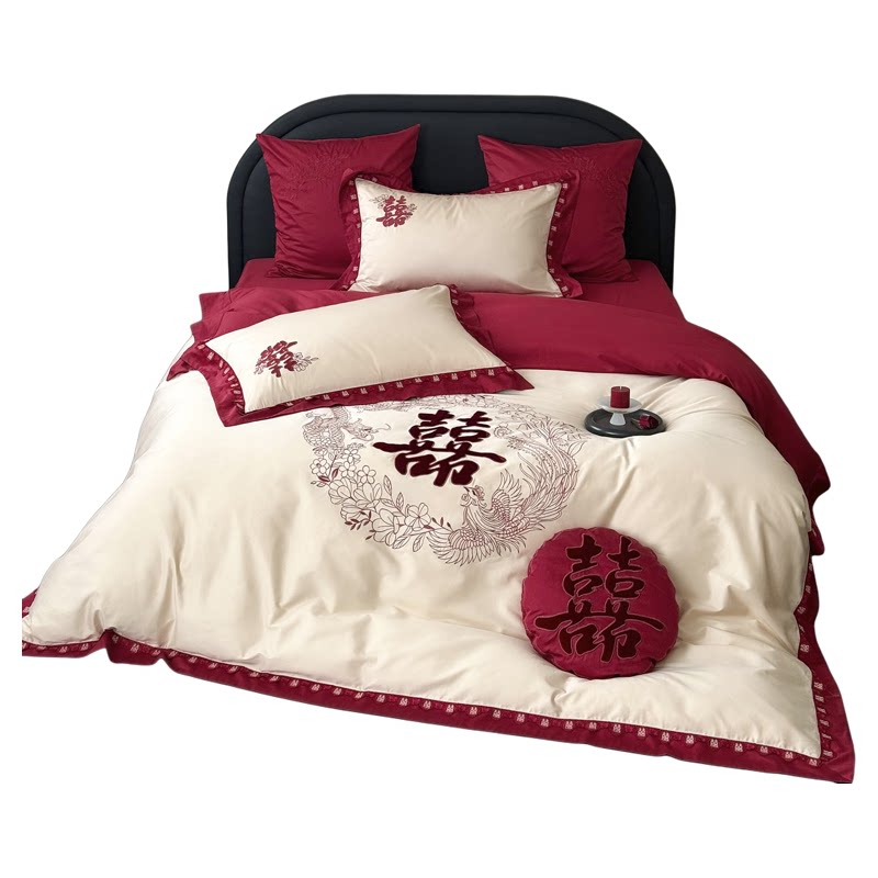 高端龙凤刺绣年轻人婚礼婚庆双囍结婚四件套全棉大红色床上用品