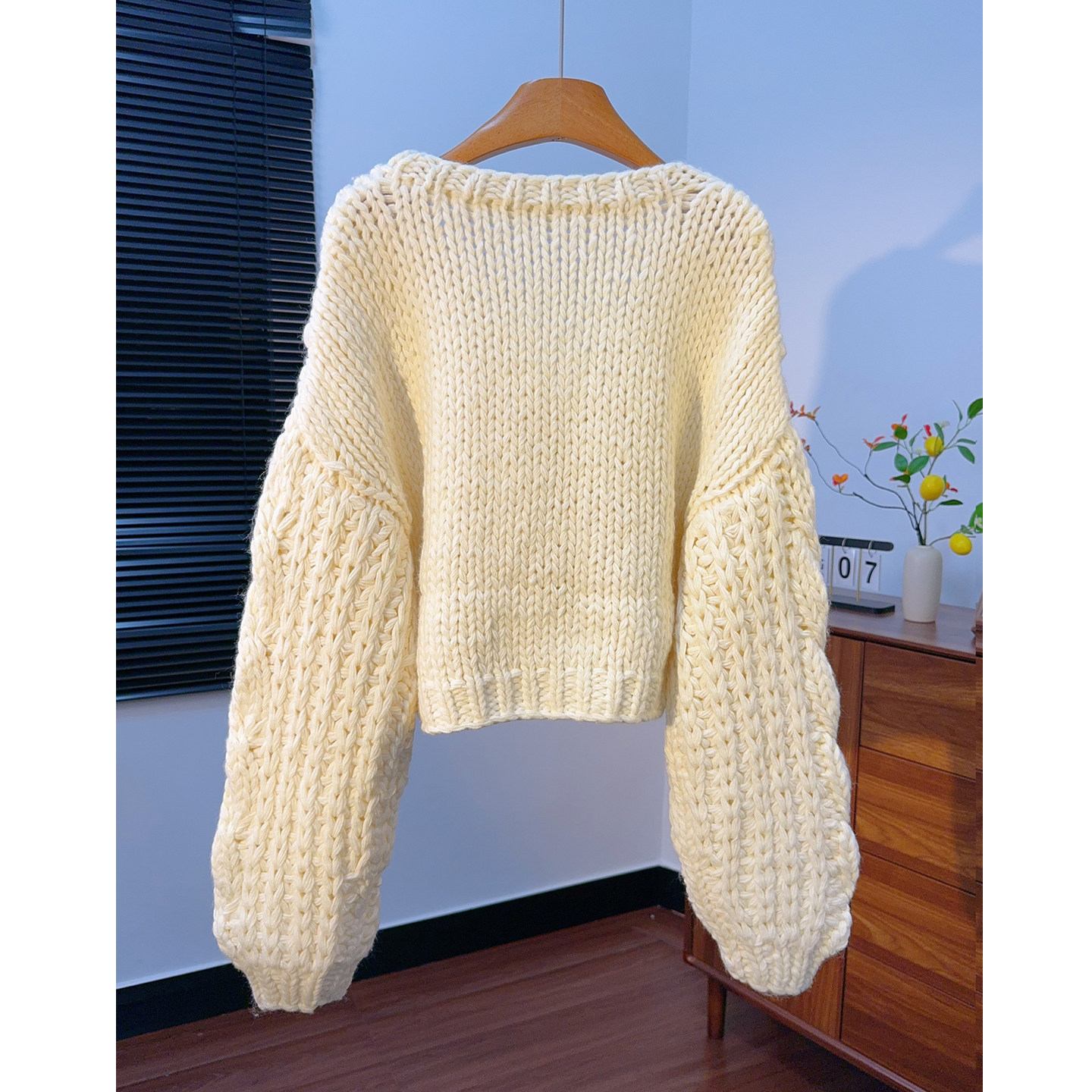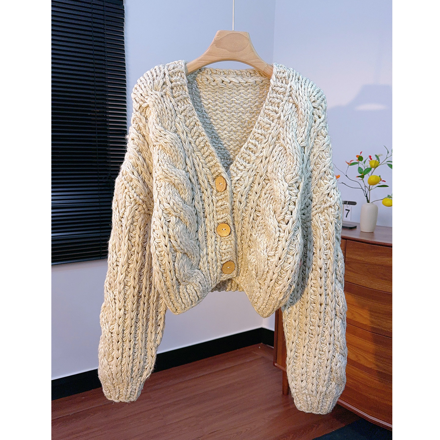 手打棒针绞花V领针织开衫女秋冬加厚短款宽松慵懒粗毛线毛衣外套