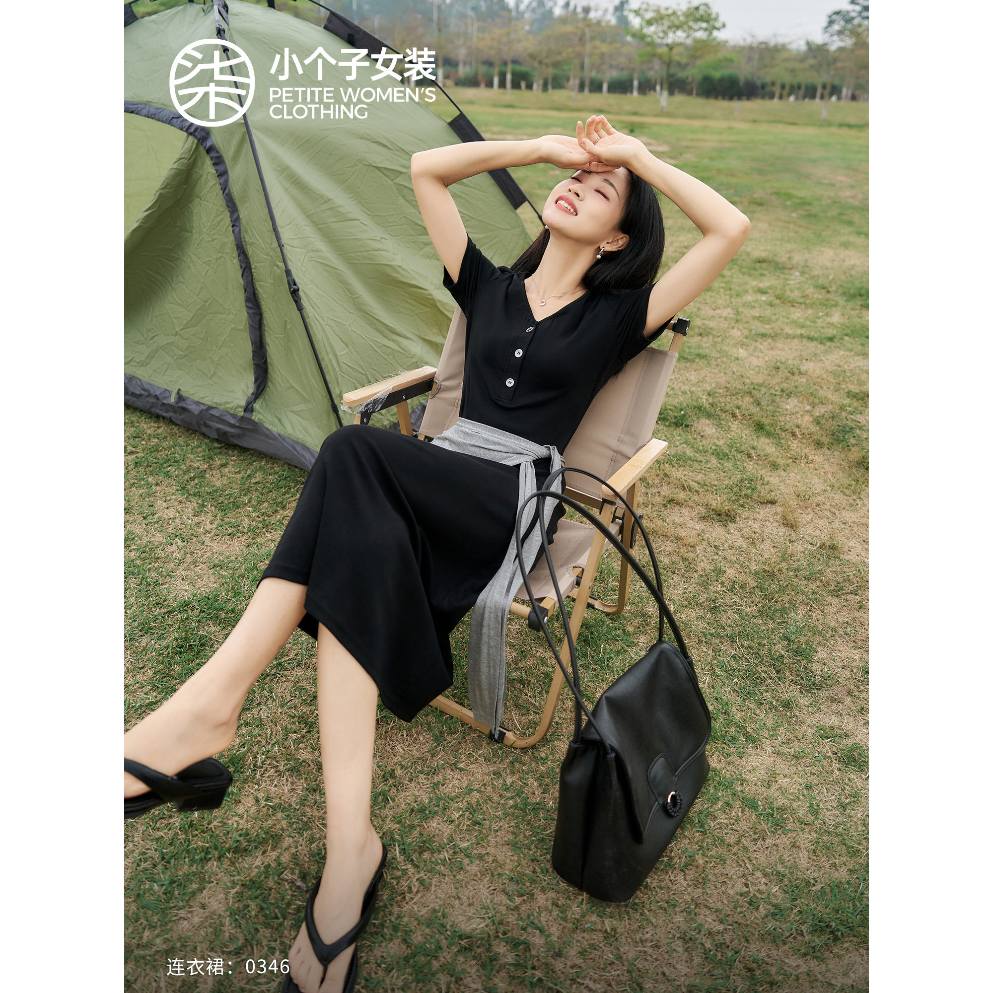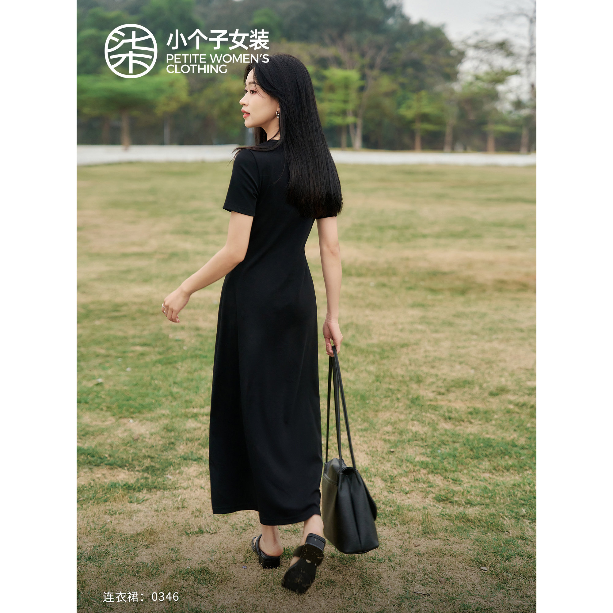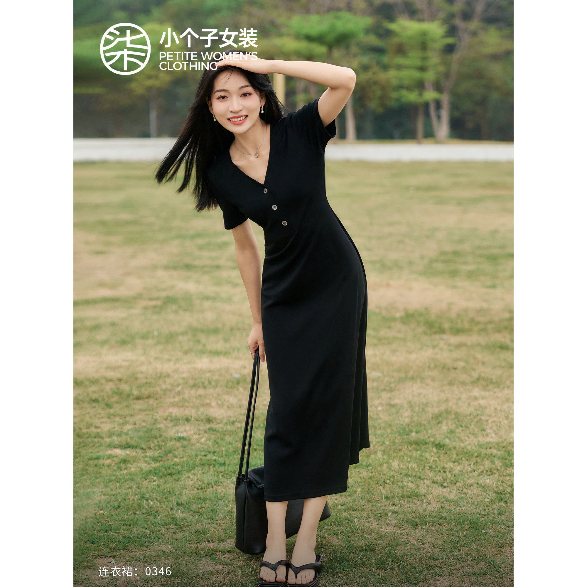 柒量一裁小个子黑色V领短袖连衣裙简约修身勾勒优雅气质长裙0346