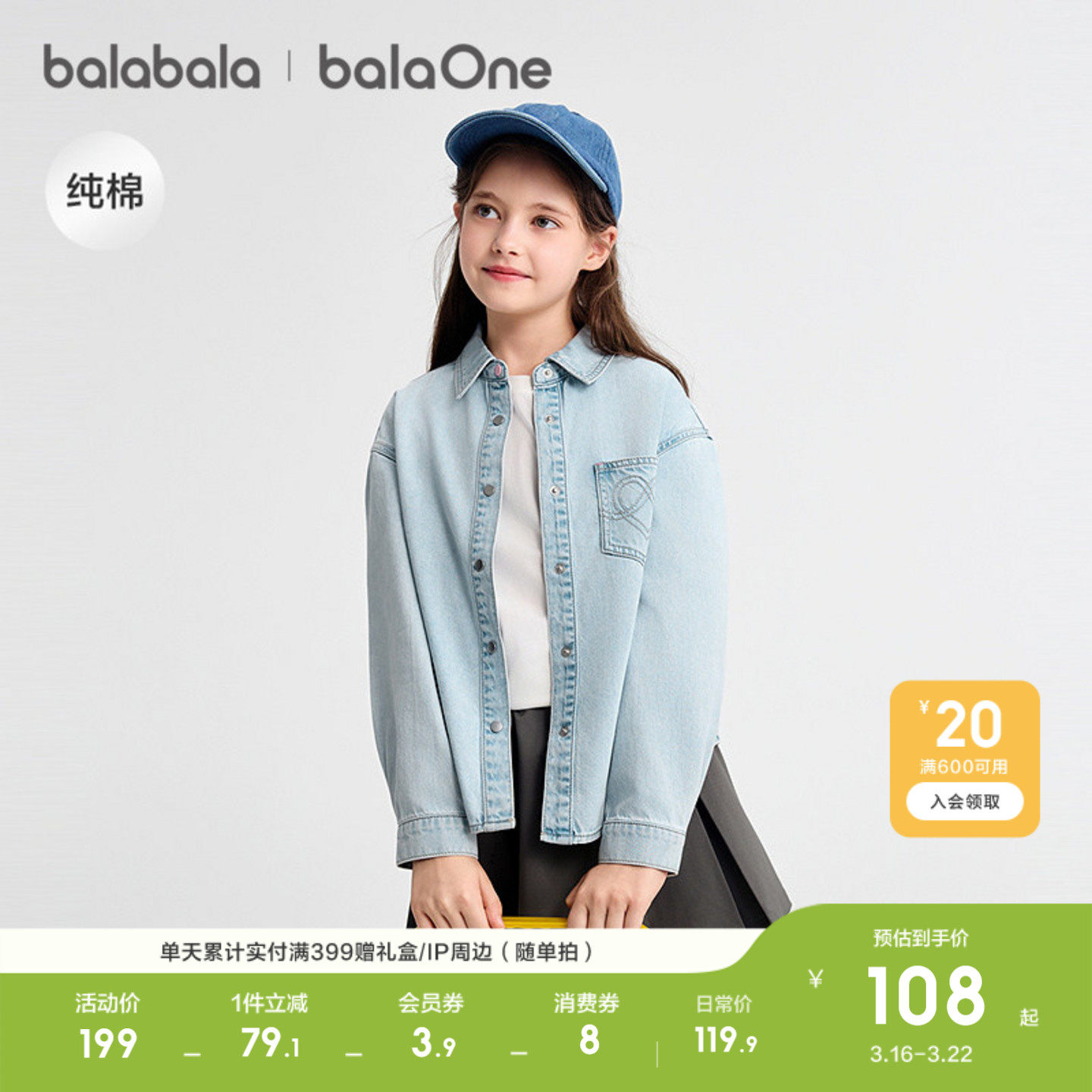 巴拉巴拉童装女童衬衫儿童长袖2026新款春装装全棉牛仔衫舒适外套