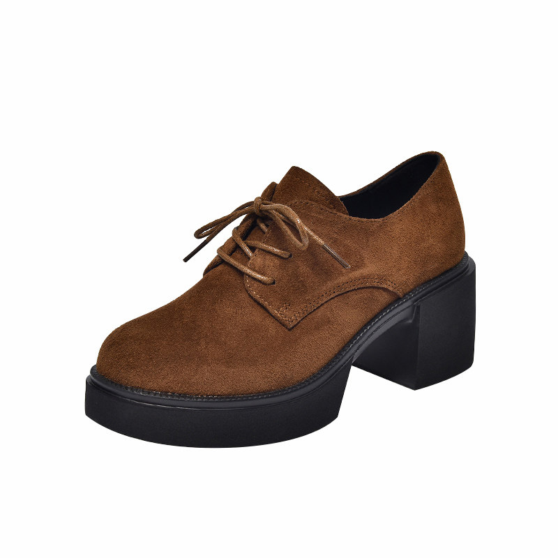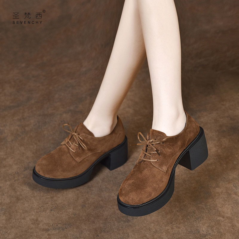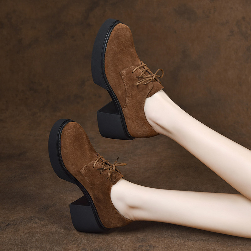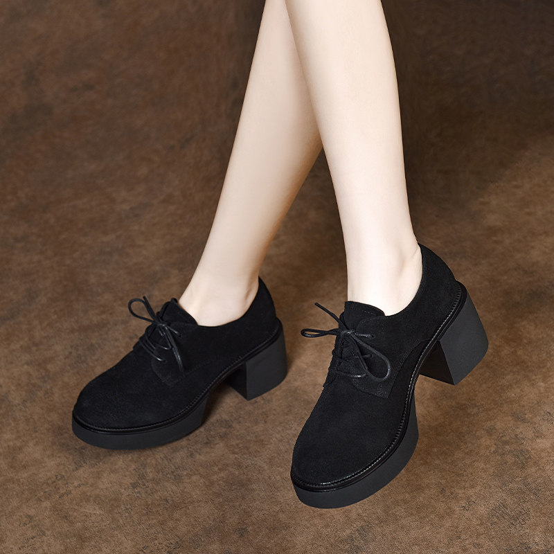2026新款春款女鞋厚底粗跟系带深口单鞋高跟鞋女英伦风磨砂小皮鞋