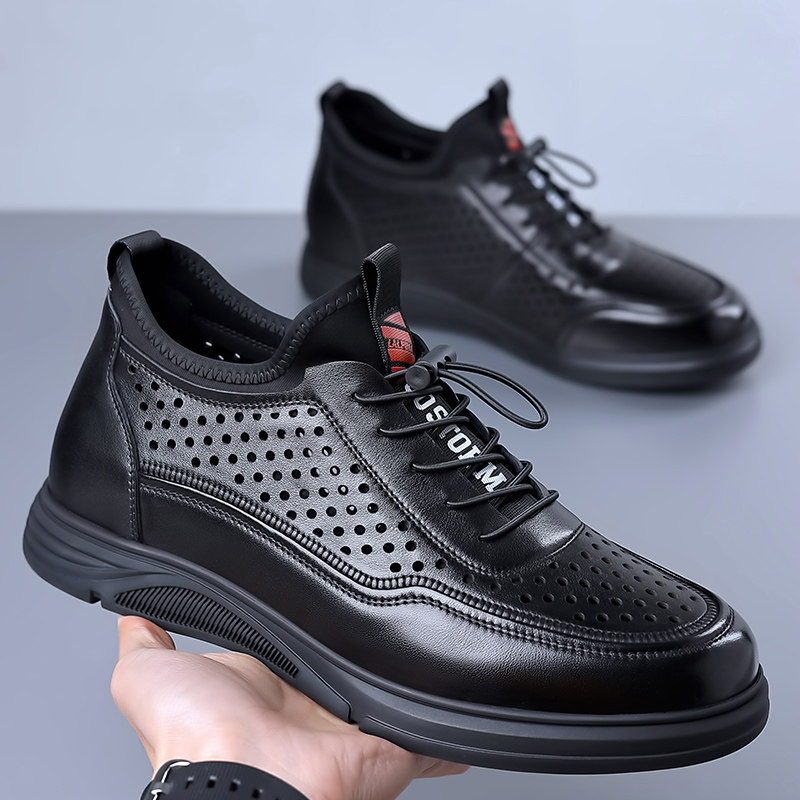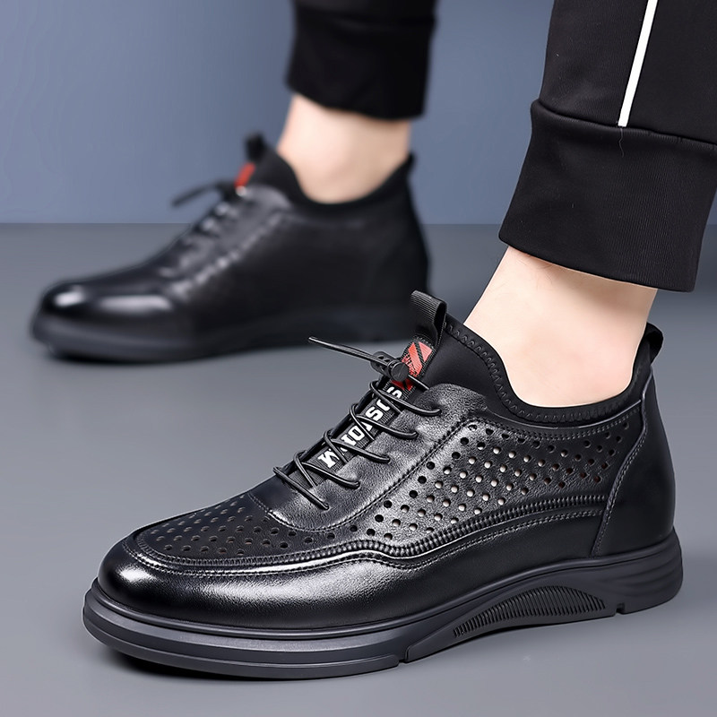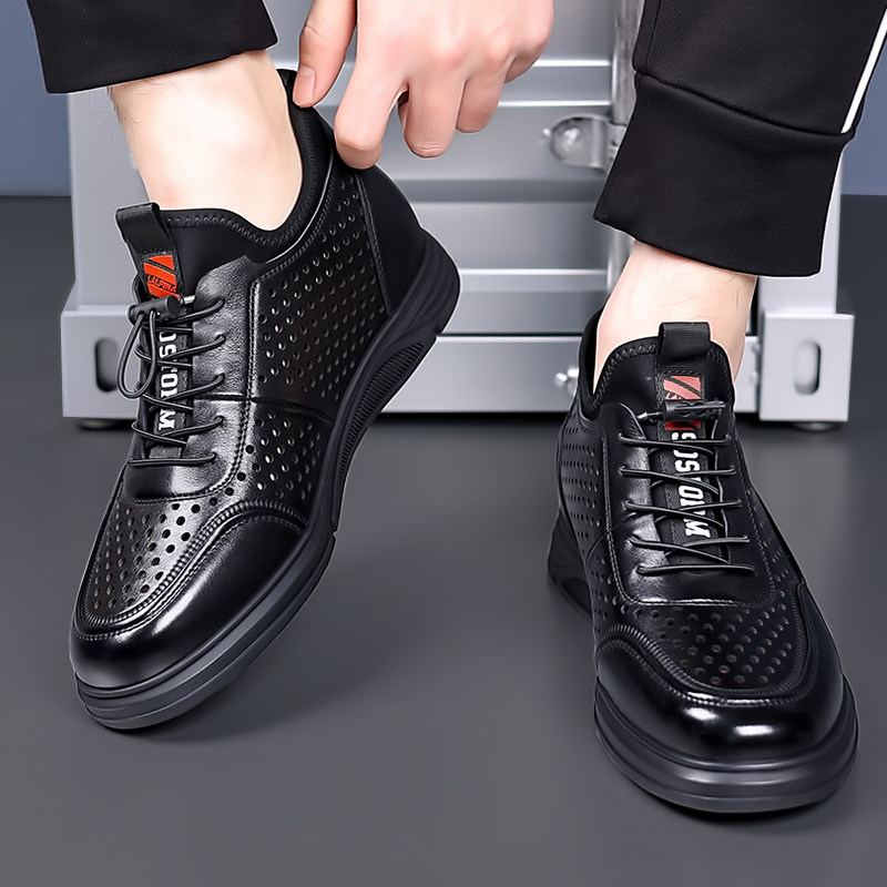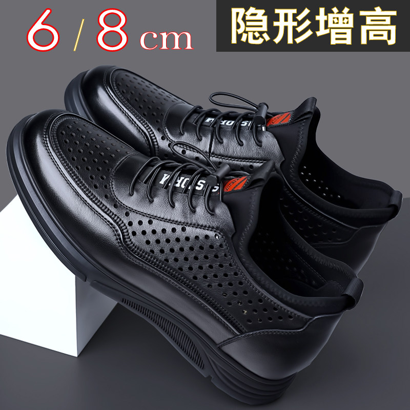 新款2026夏季凉鞋男隐形内增高男鞋镂空透气皮凉鞋真皮洞洞鞋打孔