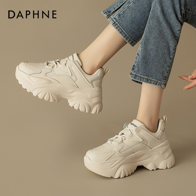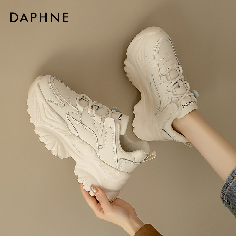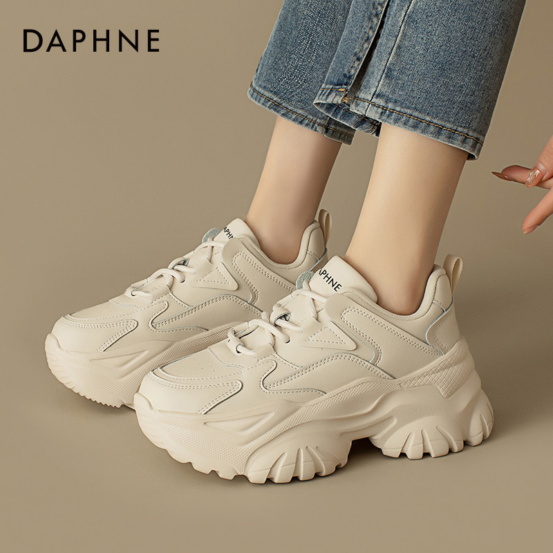 达芙妮白色老爹鞋女厚底增高皮面女鞋2025春夏季爆款显脚小运动鞋