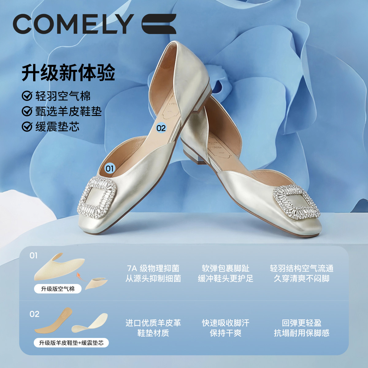 明星同款康莉真皮水钻方扣平底单鞋女2026春夏新款气质绝美凉单鞋