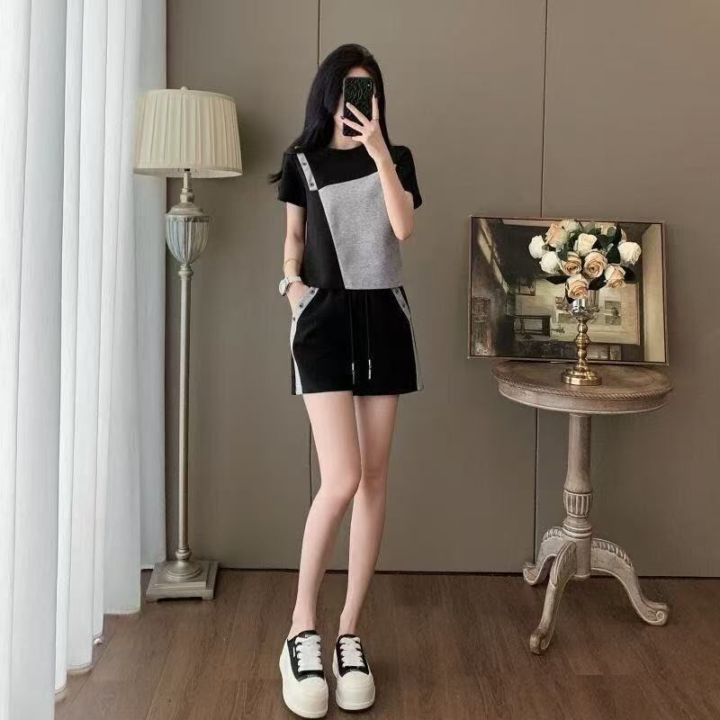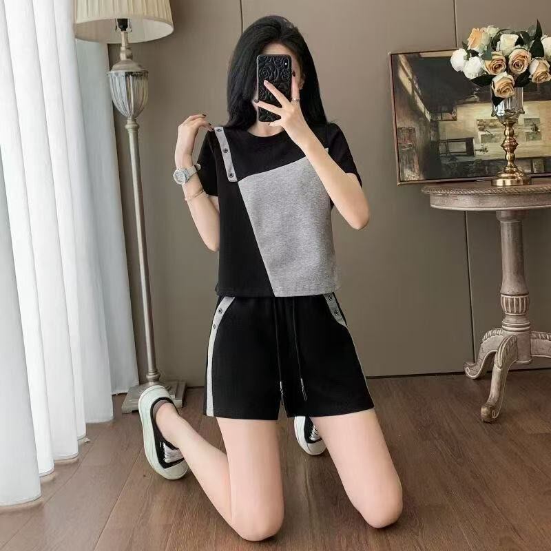 时尚拼接撞色运动服套装女2026夏季新款爆款小个子短袖短裤两件套