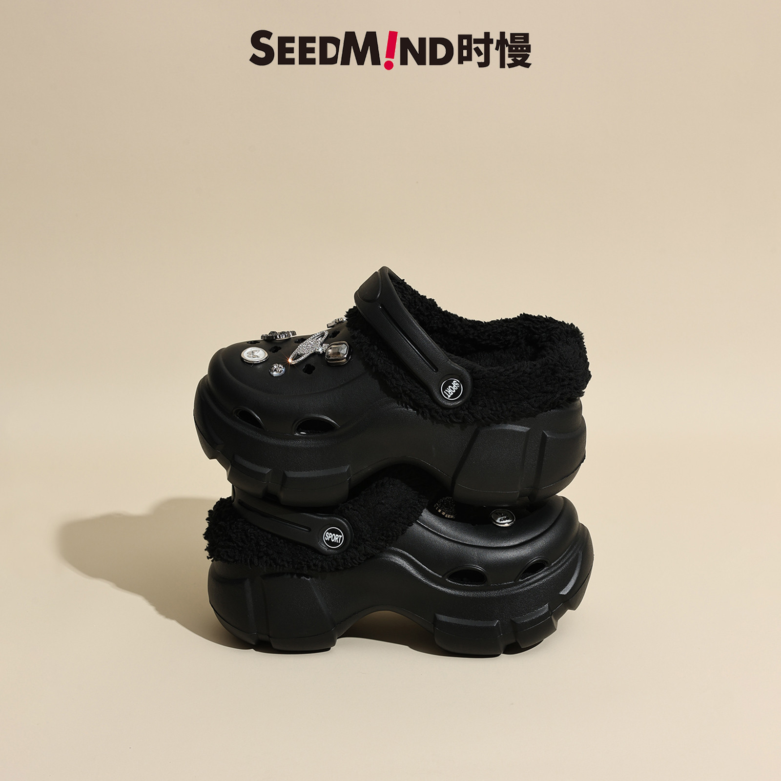 时慢外穿冬季厚底可拆卸加绒洞洞鞋女士黑色增高失落土星带绒拖鞋