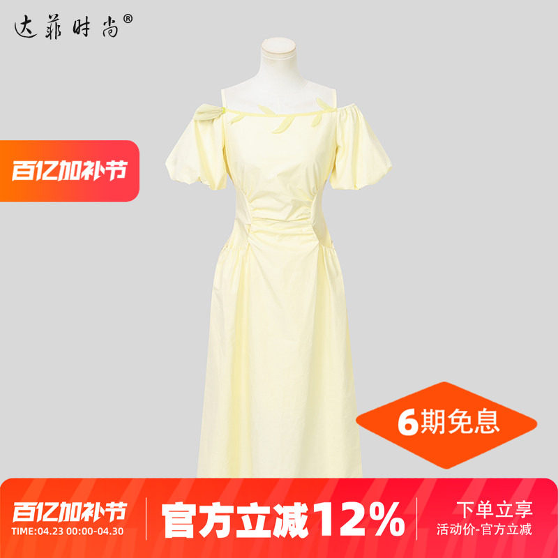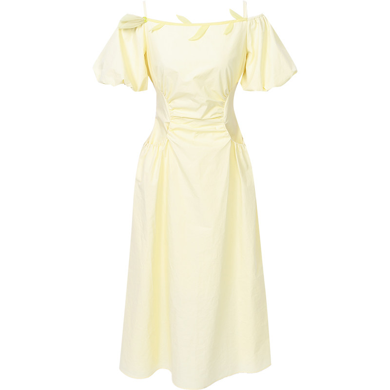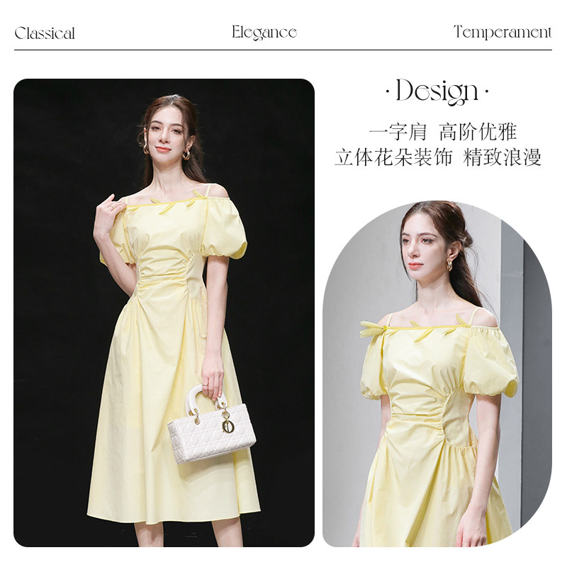 2026夏新款气质花朵装饰一字肩灯笼袖双C收腰显瘦大摆衬衣连衣裙