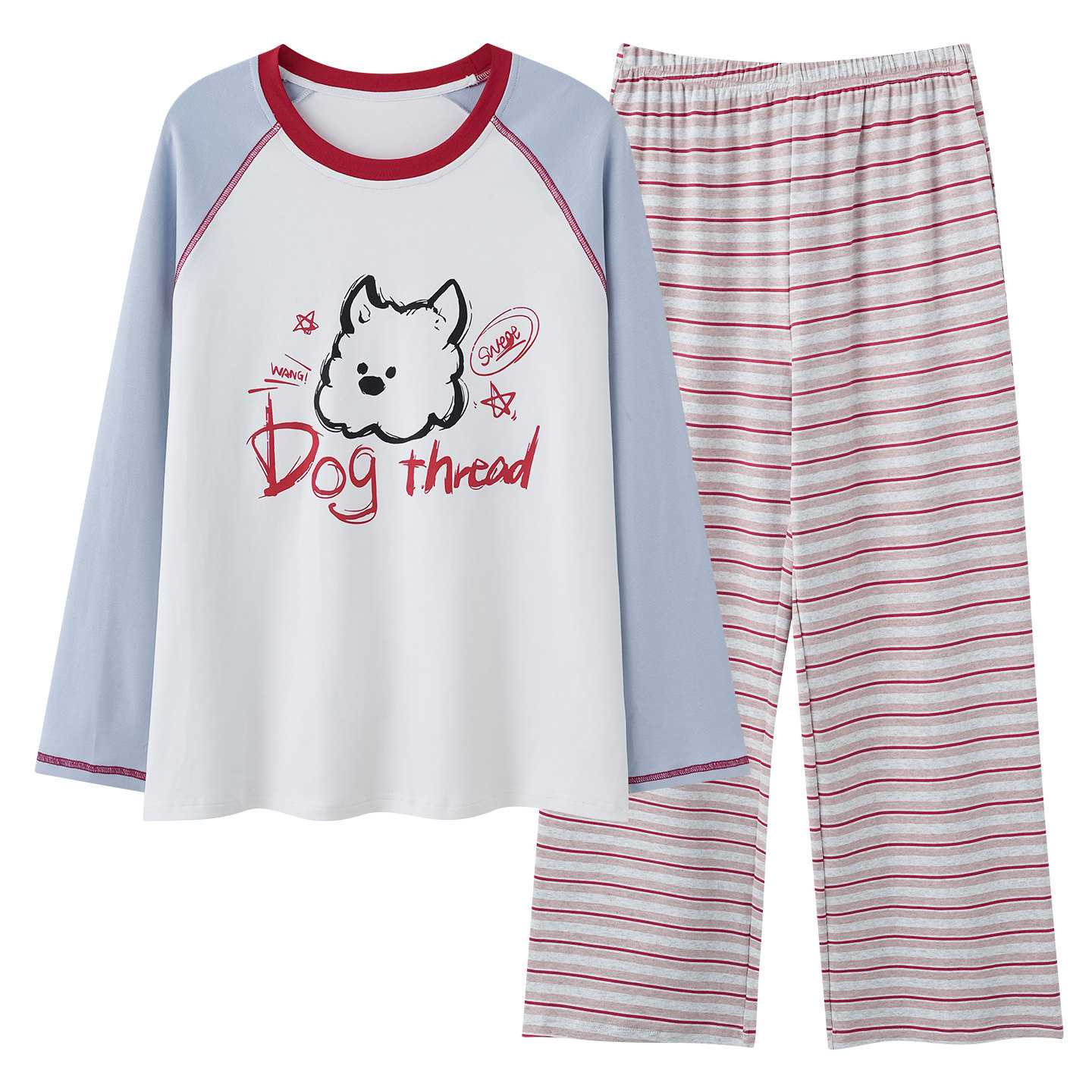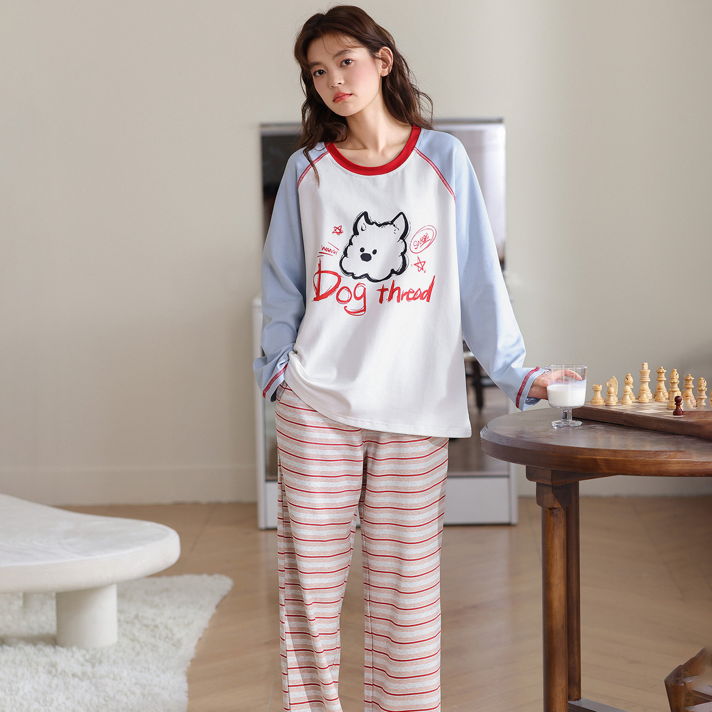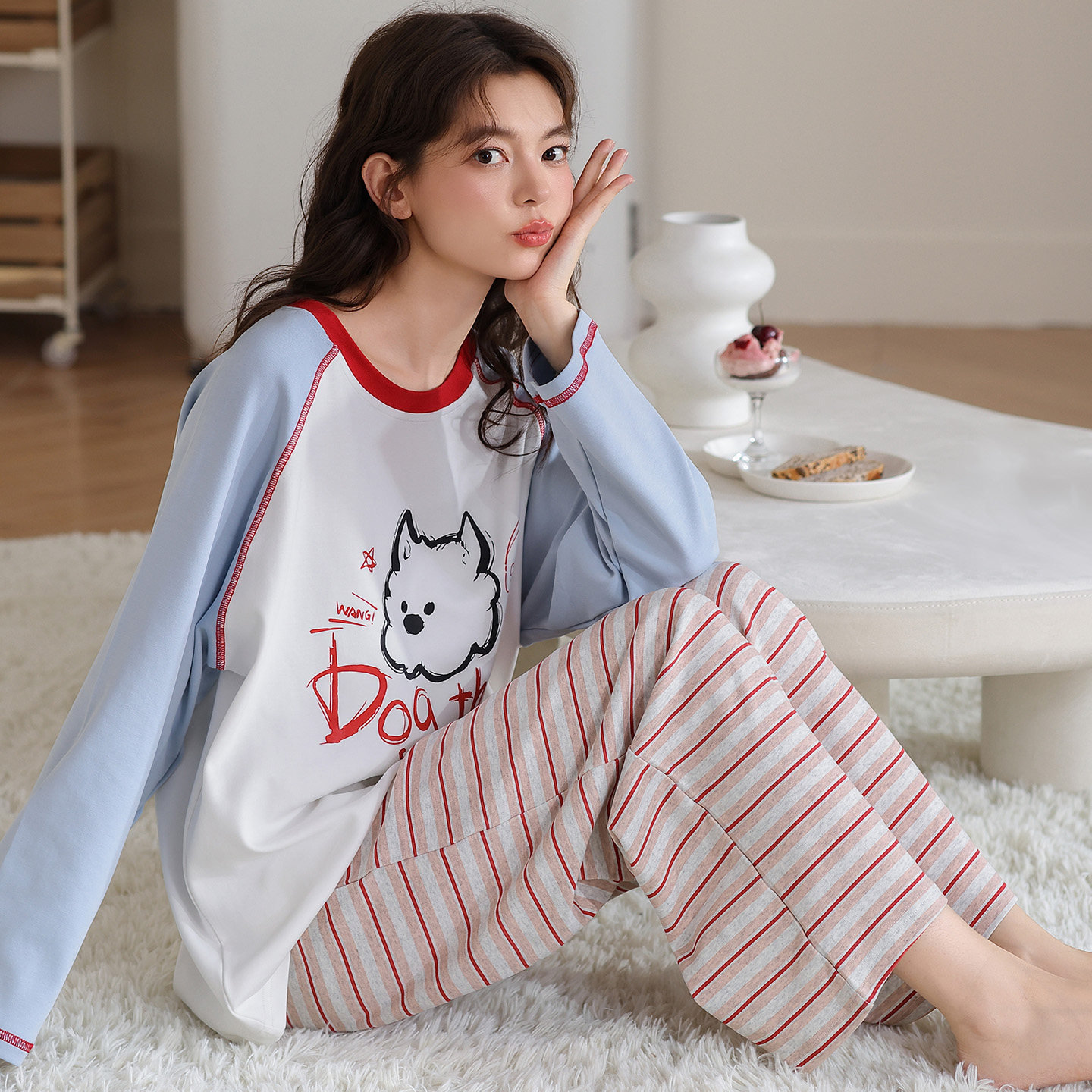 纯棉睡衣女款春秋季天长袖长裤套装2026新款可外穿条纹卡通家居服