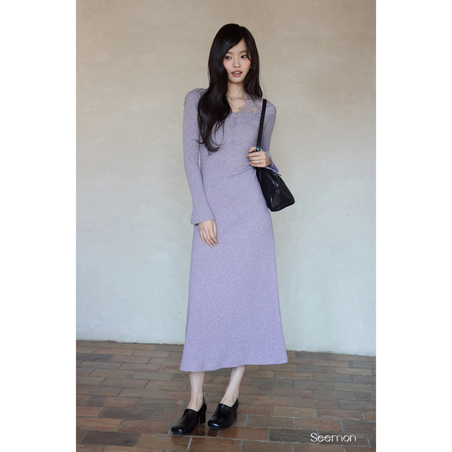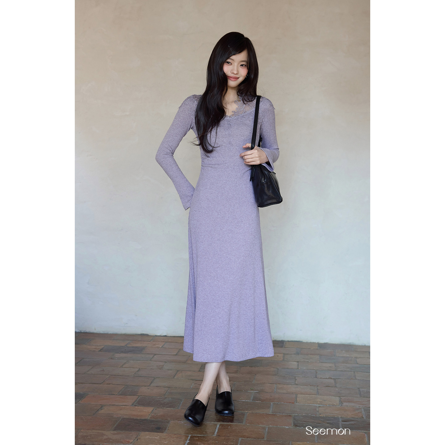 夕蒙2026新款春季韩系气质裙子小个子绝美漂亮紫色修身长袖连衣裙